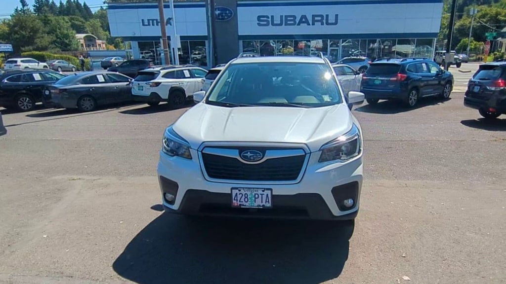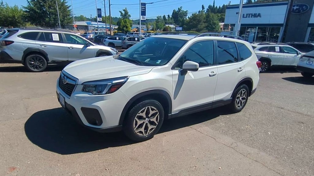 3.70 Axle Ratio, 4-Wheel Disc Brakes, 6 Speakers, ABS brakes, Air Conditioning, All-Weather Floor Liners, Alloy wheels, AM/FM radio: SiriusXM, Auto High-beam Headlights, Auto-Dimming Mirror w/Compass & HomeLink, Automatic temperature control, Brake assist, Bumpers: body-color, Cargo Tray, CD player, Cloth Upholstery, Driver door bin, Driver vanity mirror, Dual front impact airbags, Dual front side impact airbags, Electronic Stability Control, Emergency communication system: STARLINK Safety and Security (Subscription Required), Exterior Parking Camera Rear, Four wheel independent suspension, Front anti-roll bar, Front Bucket Seats, Front Center Armrest, Front fog lights, Front reading lights, Fully automatic headlights, Heated door mirrors, Heated Front Bucket Seats, Heated front seats, Illuminated entry, Knee airbag, Low tire pressure warning, Occupant sensing airbag, Outside temperature display, Overhead airbag, Overhead console, Panic alarm, Passenger door bin, Passenger vanity mirror, Power door mirrors, Power driver seat, Power moonroof: Panoramic, Power steering, Power windows, Radio data system, Radio: Subaru Starlink 6.5 Multimedia Plus System, Rear anti-roll bar, Rear Bumper Cover, Rear seat center armrest, Rear Seatback Protector, Rear window defroster, Rear window wiper, Remote keyless entry, Roof rack: rails only, Security system, Speed control, Speed-sensing steering, Split folding rear seat, Spoiler, Standard Model, STARLINK/Apple CarPlay/Android Auto, Steering wheel mounted audio controls, Tachometer, Telescoping steering wheel, Tilt steering wheel, Traction control, Trip computer, Variably intermittent wipers, Wheels: 17 x 7.0J Black Machine Finish Alloy. Crystal White Pearl 2021 Subaru Forester Premium AWD Lineartronic CVT 2.5L 4-Cylinder DOHC 16V VVT