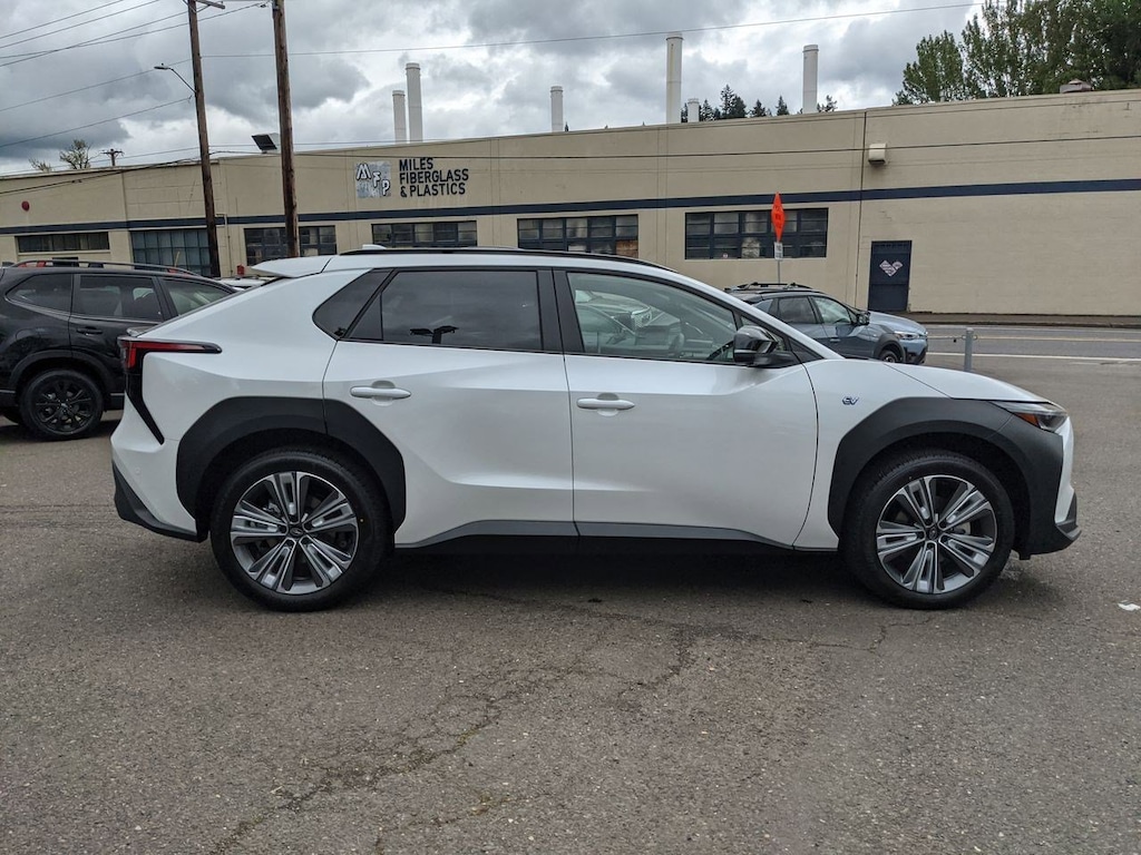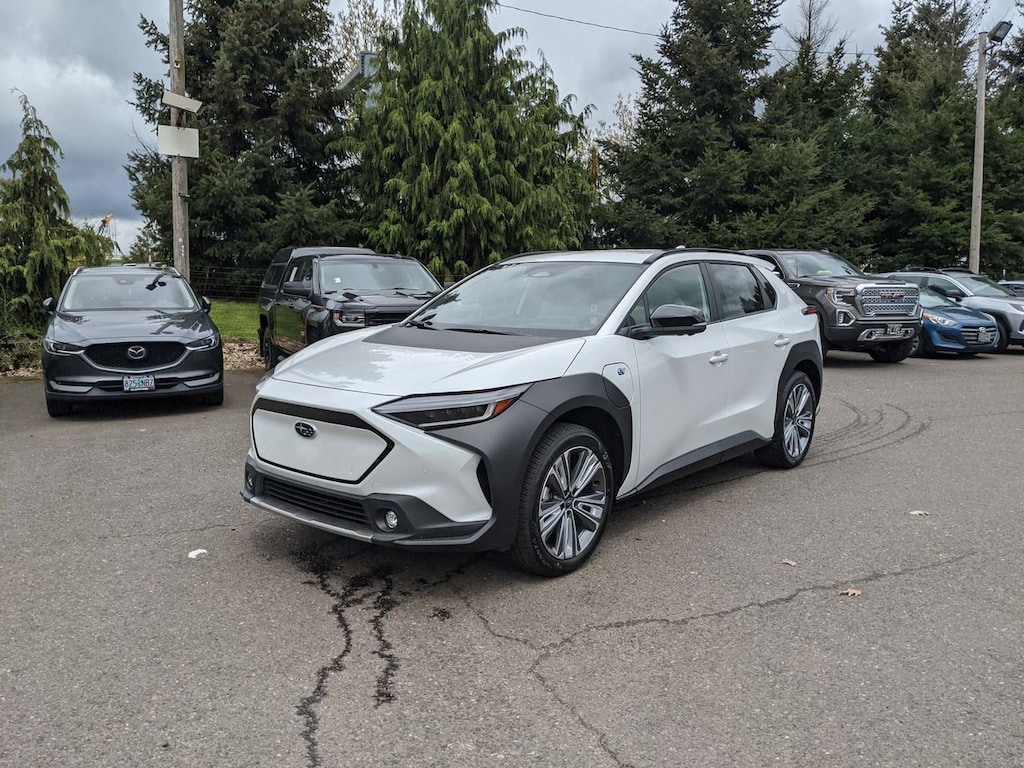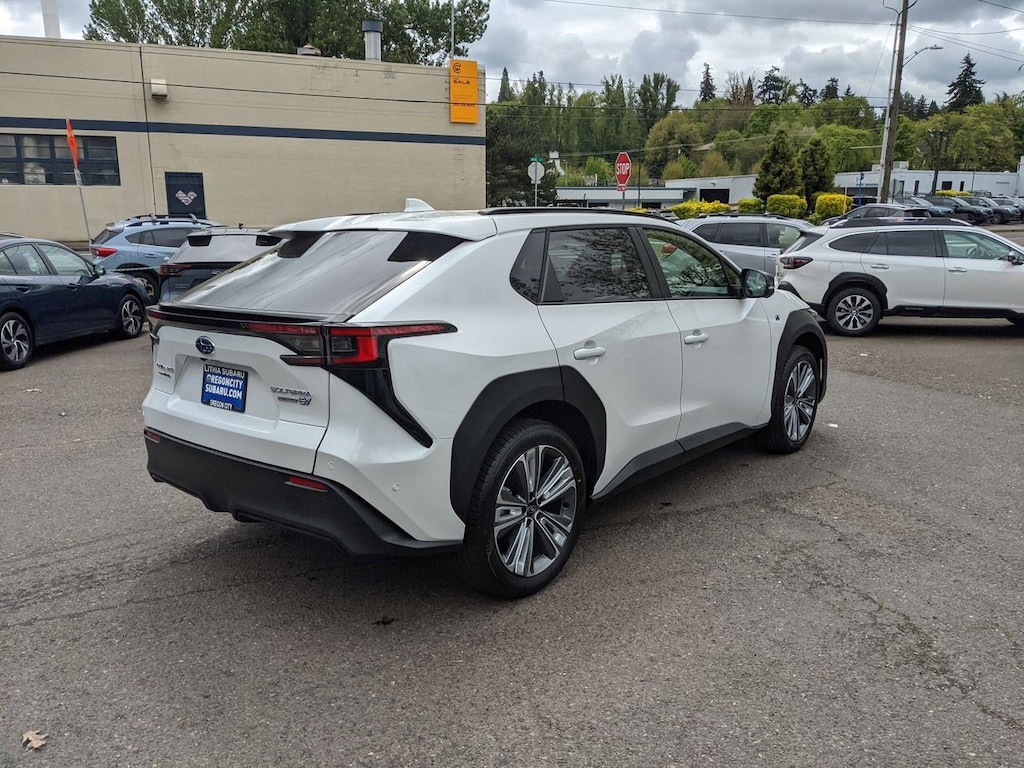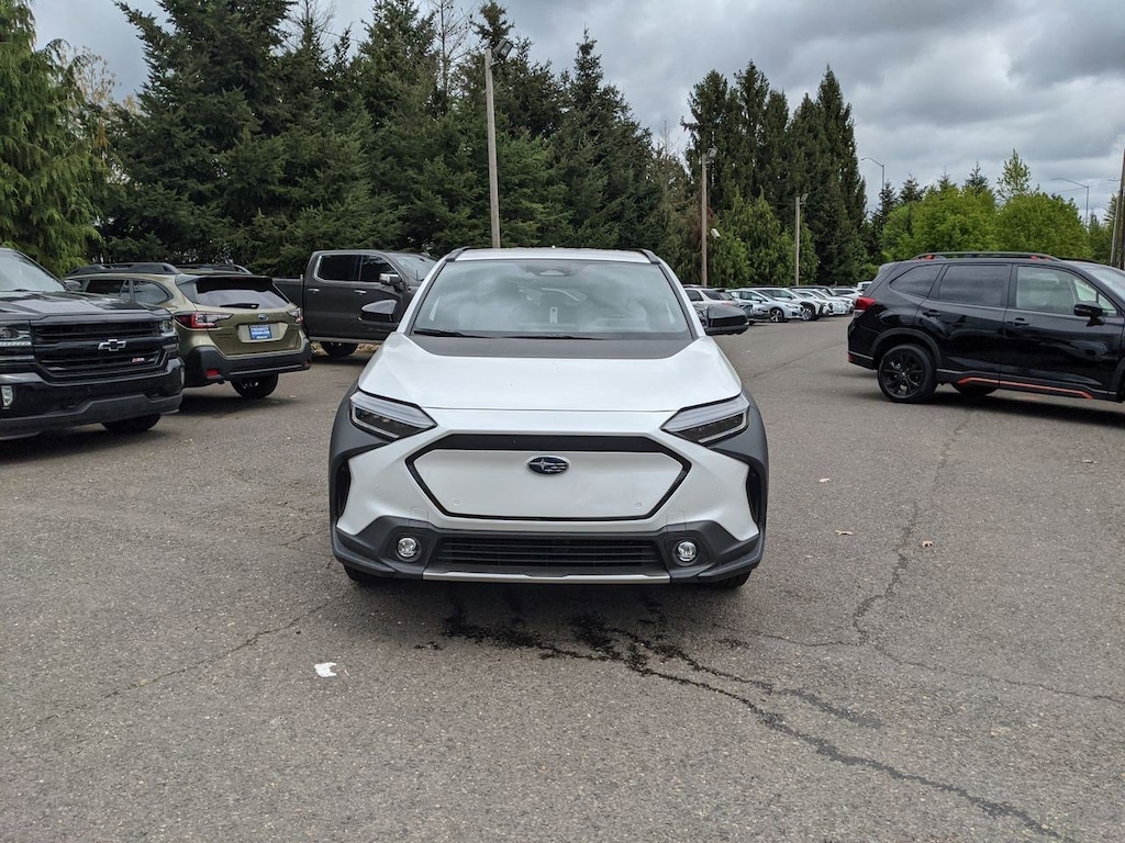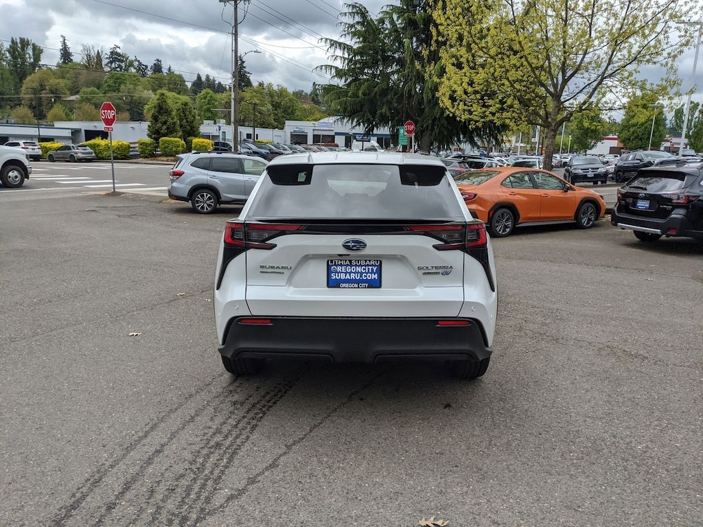 11 Speakers, 13.8 Axle Ratio, 4-Wheel Disc Brakes, ABS brakes, Air Conditioning, All-Weather Floor Liners, Alloy wheels, AM/FM radio: SiriusXM, Auto High-beam Headlights, Auto-dimming Rear-View mirror, Automatic temperature control, Brake assist, Bumpers: body-color, Cargo Cover, Cargo Tray, Driver door bin, Driver vanity mirror, Dual front impact airbags, Dual front side impact airbags, Electronic Stability Control, Emergency communication system: Subaru Solterra Connect - Safety Connect (1 year trial included), Four wheel independent suspension, Front anti-roll bar, Front Bucket Seats, Front Center Armrest, Front dual zone A/C, Front fog lights, Front reading lights, Fully automatic headlights, Garage door transmitter: HomeLink, harman/kardonî Speakers, Heated door mirrors, Heated Front Bucket Seats, Heated front seats, Heated rear seats, Heated steering wheel, Illuminated entry, Knee airbag, Leather steering wheel, Low tire pressure warning, Memory seat, Navigation system: Cloud Navigation System (Subscription required), Occupant sensing airbag, Outside temperature display, Overhead airbag, Overhead console, Panic alarm, Passenger door bin, Passenger vanity mirror, Power door mirrors, Power driver seat, Power Liftgate, Power steering, Power windows, Radio data system, Radio: Subaru Solterra Connect 12.3 Multimedia System, Rain sensing wipers, Rear anti-roll bar, Rear reading lights, Rear seat center armrest, Rear window defroster, Remote keyless entry, Security system, Speed control, Speed-sensing steering, Split folding rear seat, Spoiler, Standard Model, StarTex Upholstery, Steering wheel mounted audio controls, Telescoping steering wheel, Tilt steering wheel, Traction control, Trip computer, Turn signal indicator mirrors, Variably intermittent wipers, Wheels: 20 x 7.5 J Aluminum-Alloy Gray Finish. Cosmic White Pearl 2023 Subaru Solterra Limited AWD 1-Speed Automatic Electric Motor