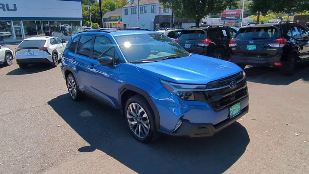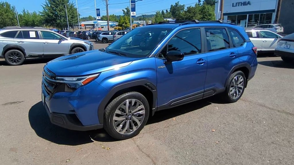 2.5L 4-Cylinder DOHC 16V, 11 Speakers, 4-Wheel Disc Brakes, ABS brakes, Air Conditioning, All-Weather Floor Liners, Alloy wheels, AM/FM radio: SiriusXM with 360L, Anti-whiplash front head restraints, Auto High-beam Headlights, Auto-Dimming Exterior Mirror w/Approach Light, Automatic temperature control, Brake assist, Bumpers: body-color, Compass, Crossbar Set - Aero, Driver door bin, Driver vanity mirror, Dual front impact airbags, Dual front side impact airbags, Electronic Stability Control, Emergency communication system: MySubaru Safety (3-year free trial), Exterior Parking Camera Rear, Four wheel independent suspension, Front anti-roll bar, Front Bucket Seats, Front Center Armrest, Front dual zone A/C, Front fog lights, Front reading lights, Fully automatic headlights, harman/kardonî Speakers, Heated & Ventilated Front Bucket Seats, Heated door mirrors, Heated front seats, Heated rear seats, Heated steering wheel, HVAC memory, Illuminated entry, Knee airbag, LED Upgrade, Low tire pressure warning, Memory seat, Navigation system: TomTom Navigation w/what3words, Occupant sensing airbag, Outside temperature display, Overhead airbag, Overhead console, Panic alarm, Passenger door bin, Passenger vanity mirror, Perforated Leather-Trimmed Upholstery, Power door mirrors, Power driver seat, Power Liftgate, Power moonroof: Panoramic, Power passenger seat, Power steering, Power windows, Radio data system, Radio: Subaru 11.6 Multimedia Navigation System, Rear anti-roll bar, Rear Bumper Cover, Rear seat center armrest, Rear Seatback Protector, Rear window defroster, Rear window wiper, Remote keyless entry, Security system, Speed control, Speed-sensing steering, Splash Guards, Split folding rear seat, Spoiler, Standard Model, Steering wheel mounted audio controls, Tachometer, Telescoping steering wheel, Tilt steering wheel, Traction control, Trip computer, Turn signal indicator mirrors, Variably intermittent wipers, Ventilated front seats, Wheels: 19 x 7.5 J Dark Gray Aluminum-Alloy, 2.5L 4-Cylinder DOHC 16V. Daybreak Blue Pearl 2025 Subaru Forester Hybrid Touring AWD Lineartronic CVT 2.5L 4-Cylinder DOHC 16V