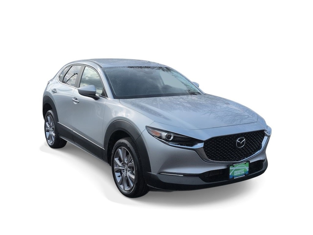 18 x 7J Alloy Wheels, 3.850 Axle Ratio, 4-Wheel Disc Brakes, 8 Speakers, ABS brakes, Air Conditioning, Alloy wheels, AM/FM radio, AppLink/Apple CarPlay and Android Auto, Auto High-beam Headlights, Automatic temperature control, Brake assist, Bumpers: body-color, Cargo Cover, Compass, Delay-off headlights, Driver door bin, Driver vanity mirror, Dual front impact airbags, Dual front side impact airbags, Electronic Stability Control, Emergency communication system: MAZDA CONNECT, Exterior Parking Camera Rear, Front anti-roll bar, Front Bucket Seats, Front Center Armrest, Front dual zone A/C, Front reading lights, Front wheel independent suspension, Fully automatic headlights, Illuminated entry, Knee airbag, Leather Shift Knob, Leather steering wheel, Leatherette Seat Trim, Low tire pressure warning, MAZDA CONNECT Infotainment System Voice Command, Occupant sensing airbag, Outside temperature display, Overhead airbag, Panic alarm, Passenger door bin, Passenger vanity mirror, Power door mirrors, Power steering, Power windows, Radio data system, Radio: AM/FM Audio System, Rain sensing wipers, Rear seat center armrest, Rear window defroster, Rear window wiper, Remote keyless entry, Select Package, Speed control, Speed-sensing steering, Split folding rear seat, Spoiler, Steering wheel mounted audio controls, Tachometer, Telescoping steering wheel, Tilt steering wheel, Traction control, Trip computer, Turn signal indicator mirrors, Variably intermittent wipers. Sonic Silver Metallic 2021 Mazda CX-30 Select AWD 6-Speed Automatic I4