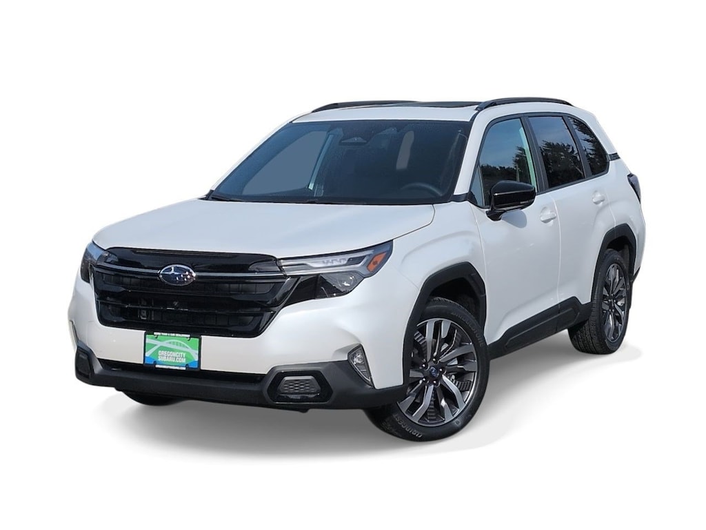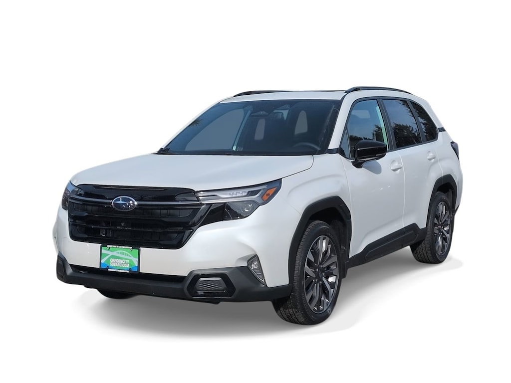 Crystal White Pearl 2026 Subaru Forester Touring AWD Lineartronic CVT 2.5L 4-Cylinder DOHC 16V 11 Speakers, 4-Wheel Disc Brakes, ABS brakes, Air Conditioning, All-Weather Floor Liners, Alloy wheels, AM/FM radio: SiriusXM with 360L, Anti-whiplash front head restraints, Auto High-beam Headlights, Auto-Dimming Exterior Mirror with Approach Light, Automatic temperature control, Brake assist, Bumpers: body-color, Cargo Net, Cargo Tray, Driver door bin, Driver vanity mirror, Dual front impact airbags, Dual front side impact airbags, Electronic Stability Control, Emergency communication system: MySubaru Companion (5-years free), Exterior Parking Camera Rear, Four wheel independent suspension, Front anti-roll bar, Front Bucket Seats, Front Center Armrest, Front dual zone A/C, Front fog lights, Front reading lights, Fully automatic headlights, harman/kardonî Speakers, Heads-Up Display, Heated and Ventilated Front Bucket Seats, Heated door mirrors, Heated front seats, Heated rear seats, Heated steering wheel, HVAC memory, Illuminated entry, Knee airbag, Leather Shift Knob, Leather steering wheel, Low tire pressure warning, Memory seat, Navigation System, Occupant sensing airbag, Outside temperature display, Overhead airbag, Overhead console, Panic alarm, Passenger door bin, Passenger vanity mirror, Perforated Leather-Trimmed Upholstery, Power door mirrors, Power driver seat, Power Liftgate, Power moonroof: Panoramic, Power passenger seat, Power steering, Power windows, Radio data system, Radio: Subaru 11.6 Multimedia Navigation System, Rain sensing wipers, Rear anti-roll bar, Rear Bumper Cover, Rear seat center armrest, Rear window defroster, Rear window wiper, Remote keyless entry, Security system, Speed control, Speed-sensing steering, Splash Guards, Split folding rear seat, Spoiler, Standard Model, Steering wheel mounted audio controls, Tachometer, Telescoping steering wheel, Tilt steering wheel, Traction control, Trip computer, Turn signal indicator mirrors, Variably intermittent wipers, Ventilated front seats, Wheels: 19 x 7.5 J Dark Gray Aluminum-Alloy.