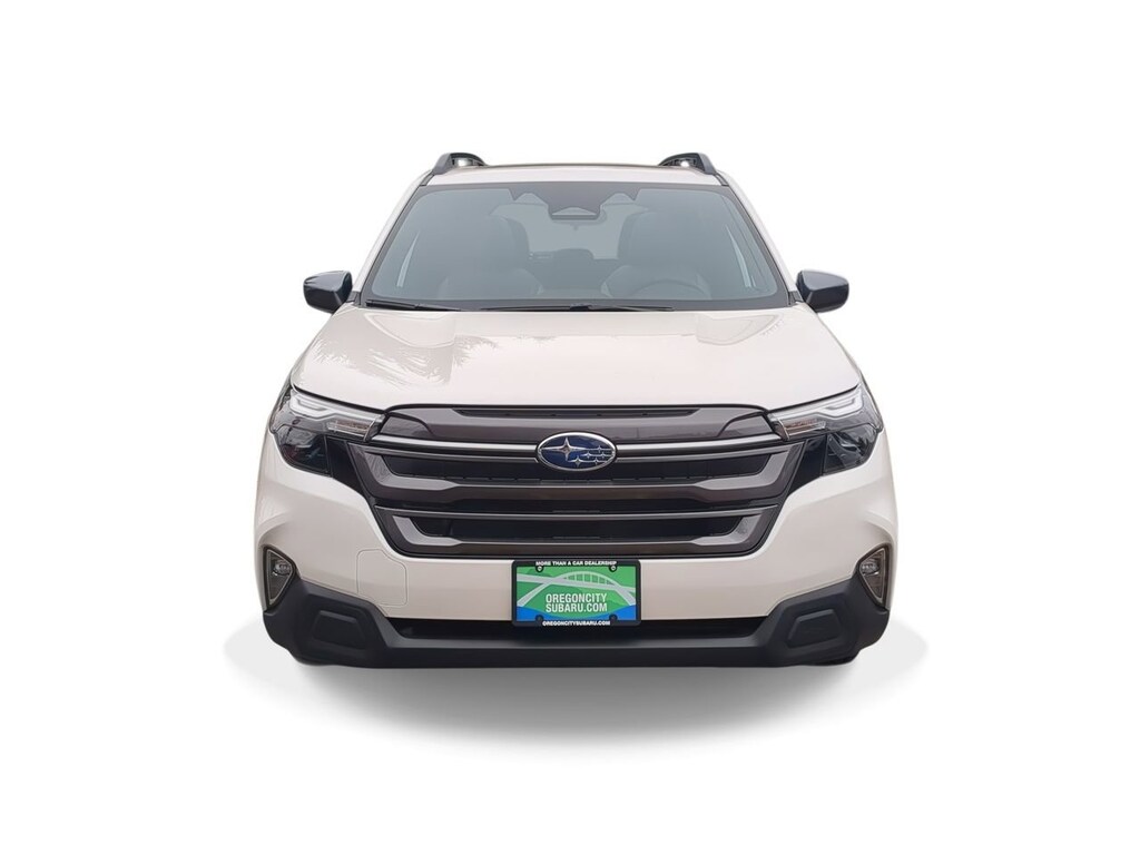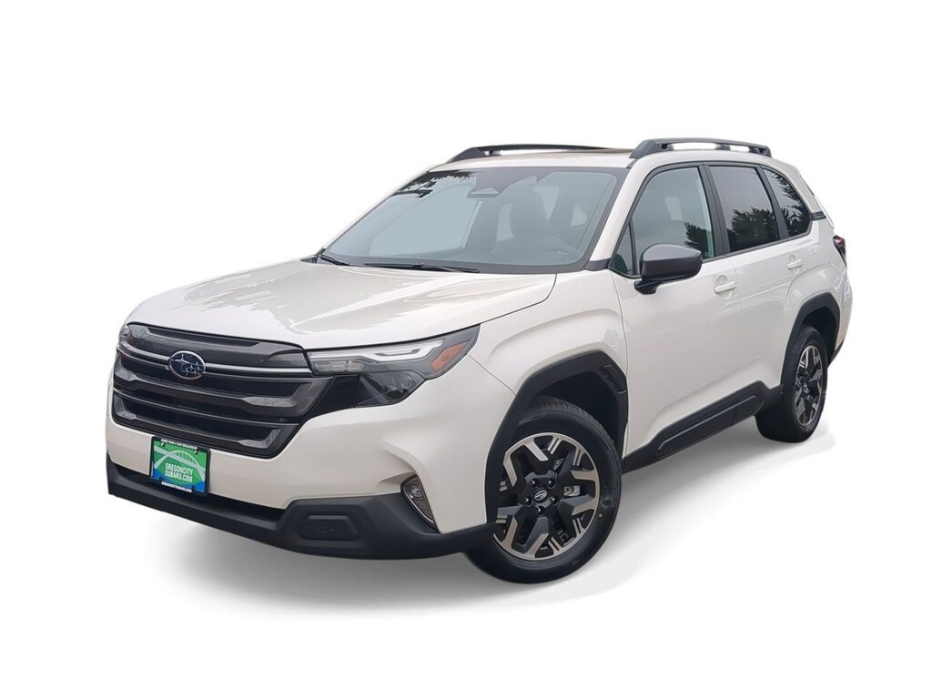 Crystal White Pearl 2026 Subaru Forester Premium AWD Lineartronic CVT 2.5L 4-Cylinder DOHC 16V 4-Wheel Disc Brakes, 6 Speakers, ABS brakes, Air Conditioning, Alloy wheels, AM/FM radio: SiriusXM with 360L, Anti-whiplash front head restraints, Auto High-beam Headlights, Automatic temperature control, Brake assist, Bumpers: body-color, Driver door bin, Driver vanity mirror, Dual front impact airbags, Dual front side impact airbags, Electronic Stability Control, Emergency communication system: MySubaru Companion (5-years free), Exterior Parking Camera Rear, Four wheel independent suspension, Front anti-roll bar, Front Bucket Seats, Front Center Armrest, Front dual zone A/C, Front fog lights, Front reading lights, Fully automatic headlights, Heated door mirrors, Heated Front Bucket Seats, Heated front seats, Illuminated entry, Knee airbag, Leather steering wheel, Low tire pressure warning, Occupant sensing airbag, Outside temperature display, Overhead airbag, Overhead console, Panic alarm, Passenger door bin, Passenger vanity mirror, Power door mirrors, Power driver seat, Power moonroof: Panoramic, Power steering, Power windows, Premium Textured Cloth Upholstery, Radio data system, Radio: Subaru 11.6 Multimedia Plus System, Rear anti-roll bar, Rear seat center armrest, Rear window defroster, Rear window wiper, Remote keyless entry, Security system, Speed control, Speed-sensing steering, Split folding rear seat, Spoiler, Steering wheel mounted audio controls, Tachometer, Telescoping steering wheel, Tilt steering wheel, Traction control, Trip computer, Variably intermittent wipers, Wheels: 17 x 7.0 J Dark Metallic Aluminum-Alloy.