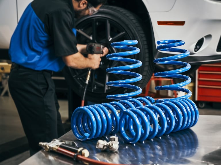 Several components, including shock absorbers, control arms, and springs, make up the suspension system. Springs add the "bounce" in the system; control arms connect the suspension to the wheels; shock absorbers keep the vehicle from bouncing too much. All are vital for your suspension to function properly.