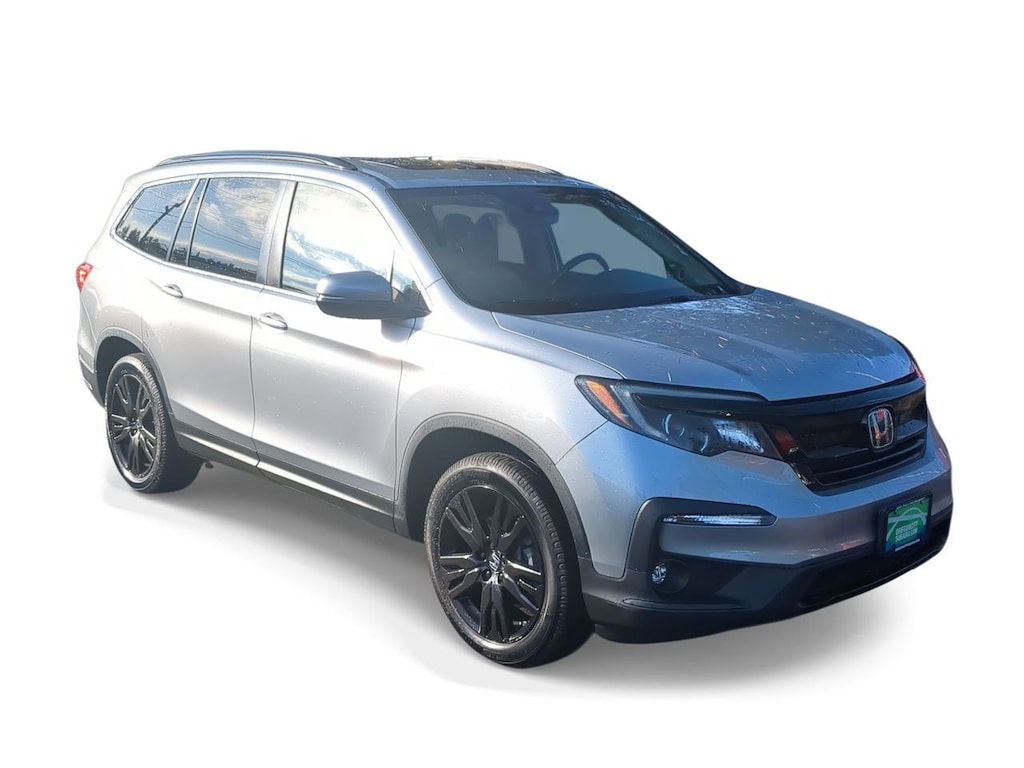 AWD, 3rd row seats: split-bench, 4-Wheel Disc Brakes, 4.33 Axle Ratio, 7 Speakers, A/V remote: CabinControl, ABS brakes, Air Conditioning, Alloy wheels, AM/FM radio: SiriusXM, Apple CarPlay/Android Auto, Auto High-beam Headlights, Auto-dimming Rear-View mirror, Automatic temperature control, Blind Spot Information (BSI) System warning, Brake assist, Bumpers: body-color, Delay-off headlights, Driver door bin, Driver vanity mirror, Dual front impact airbags, Dual front side impact airbags, Electronic Stability Control, Emergency communication system: HondaLink Assist, Exterior Parking Camera Rear, Forward collision: Collision Mitigation Braking System (CMBS) + FCW mitigation, Four wheel independent suspension, Front anti-roll bar, Front Bucket Seats, Front Center Armrest, Front dual zone A/C, Front fog lights, Front reading lights, Fully automatic headlights, Garage door transmitter: HomeLink, Heated door mirrors, Heated Front Bucket Seats, Heated front seats, Illuminated entry, Lane departure: Lane Keeping Assist System (LKAS) active, Leather Seat Trim, Low tire pressure warning, Memory seat, Occupant sensing airbag, Outside temperature display, Overhead airbag, Overhead console, Panic alarm, Passenger door bin, Passenger vanity mirror, Power door mirrors, Power driver seat, Power Liftgate, Power moonroof, Power passenger seat, Power steering, Power windows, Radio data system, Radio: 215-Watt Audio System, Rear air conditioning, Rear anti-roll bar, Rear reading lights, Rear seat center armrest, Rear window defroster, Rear window wiper, Reclining 3rd row seat, Remote keyless entry, Roof rack: rails only, Security system, Speed control, Speed-sensing steering, Speed-Sensitive Wipers, Split folding rear seat, Spoiler, Steering wheel mounted audio controls, Tachometer, Telescoping steering wheel, Tilt steering wheel, Traction control, Trip computer, Turn signal indicator mirrors, Variably intermittent wipers, Wheels: 20 Exclusive Black-Painted Alloy, AWD. Silver 2021 Honda Pilot Special Edition AWD 9-Speed Automatic 3.5L V6 24V SOHC i-VTEC