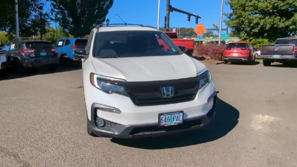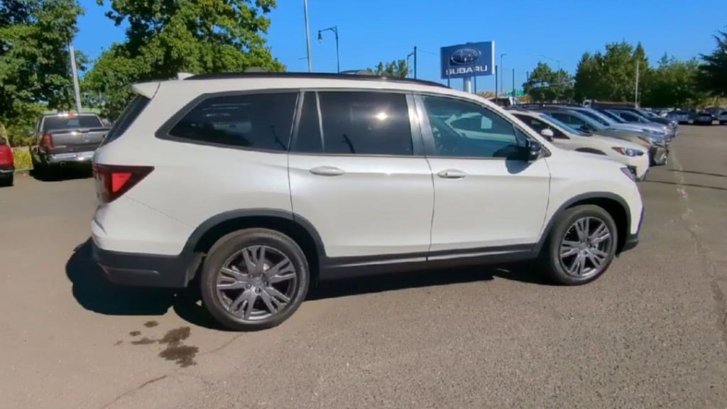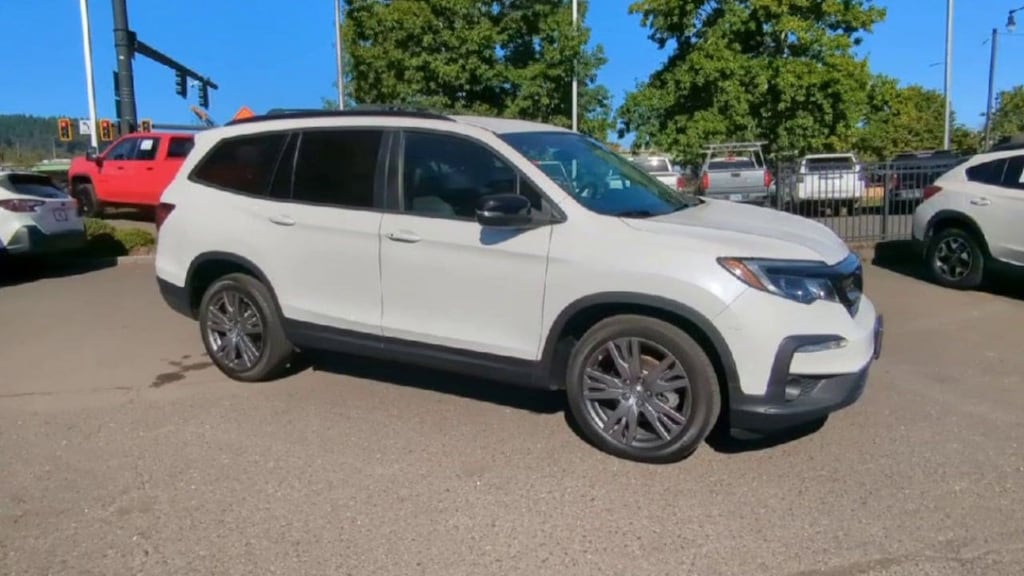 AWD, 3rd row seats: split-bench, 4-Wheel Disc Brakes, 4.33 Axle Ratio, 7 Speakers, A/V remote: CabinControl, ABS brakes, Air Conditioning, Alloy wheels, AM/FM radio: SiriusXM, Apple CarPlay/Android Auto, Auto High-beam Headlights, Automatic temperature control, Blind Spot Information (BSI) System warning, Brake assist, Bumpers: body-color, Cloth Seat Trim, Delay-off headlights, Driver door bin, Driver vanity mirror, Dual front impact airbags, Dual front side impact airbags, Electronic Stability Control, Emergency communication system: HondaLink Assist, Exterior Parking Camera Rear, Forward collision: Collision Mitigation Braking System (CMBS) + FCW mitigation, Four wheel independent suspension, Front anti-roll bar, Front Bucket Seats, Front Center Armrest, Front dual zone A/C, Front fog lights, Front reading lights, Fully automatic headlights, Heated door mirrors, Heated Front Bucket Seats, Heated front seats, Illuminated entry, Lane departure: Lane Keeping Assist System (LKAS) active, Low tire pressure warning, Occupant sensing airbag, Outside temperature display, Overhead airbag, Overhead console, Panic alarm, Passenger door bin, Passenger vanity mirror, Power door mirrors, Power driver seat, Power steering, Power windows, Radio data system, Radio: 215-Watt Audio System, Rear air conditioning, Rear anti-roll bar, Rear reading lights, Rear seat center armrest, Rear window defroster, Rear window wiper, Reclining 3rd row seat, Remote keyless entry, Roof rack: rails only, Security system, Speed control, Speed-sensing steering, Speed-Sensitive Wipers, Split folding rear seat, Spoiler, Steering wheel mounted audio controls, Tachometer, Telescoping steering wheel, Tilt steering wheel, Traction control, Trip computer, Turn signal indicator mirrors, Variably intermittent wipers, Wheels: 20 Pewter Gray Alloy, AWD. White 2022 Honda Pilot Sport AWD 9-Speed Automatic 3.5L V6 24V SOHC i-VTEC