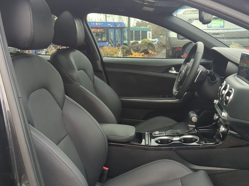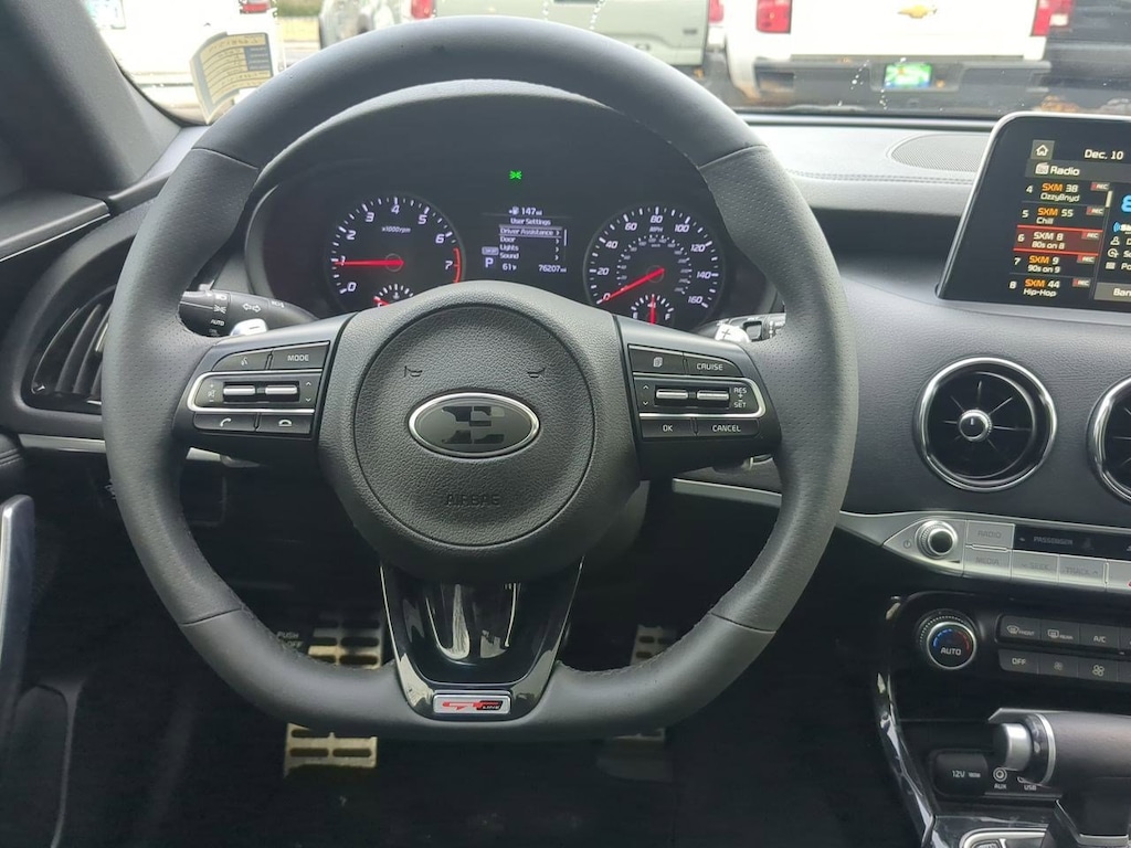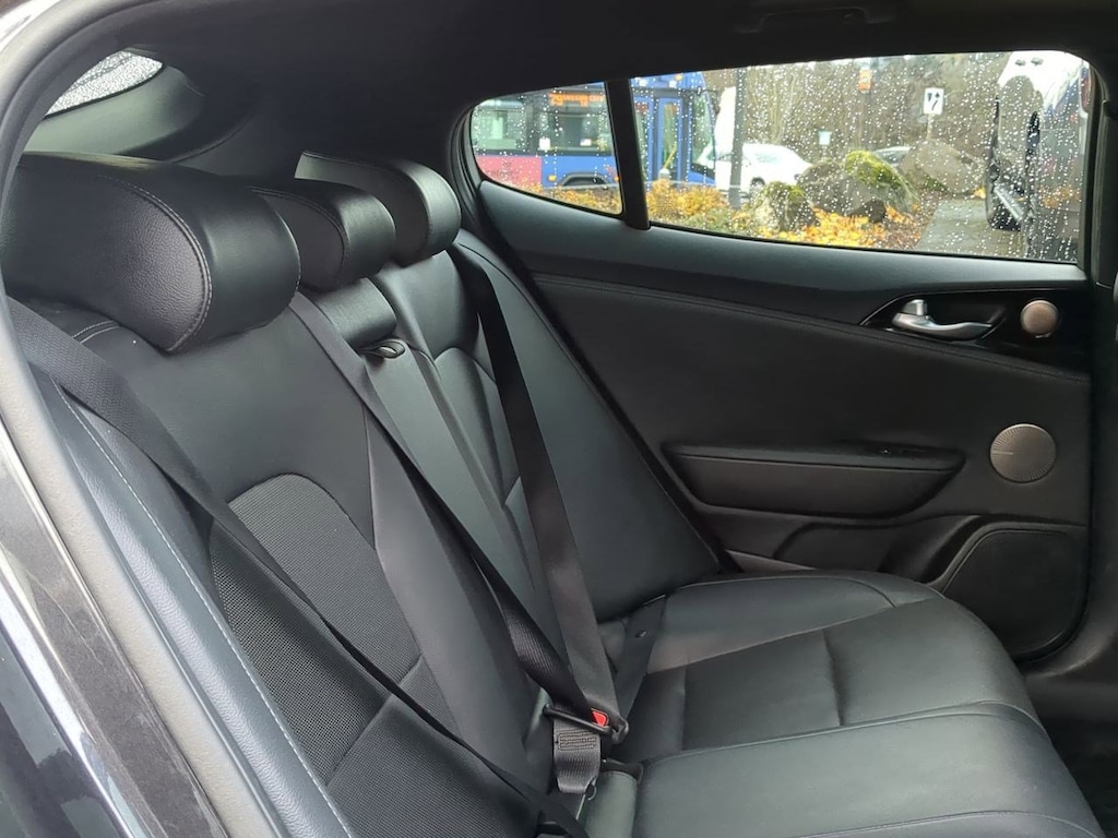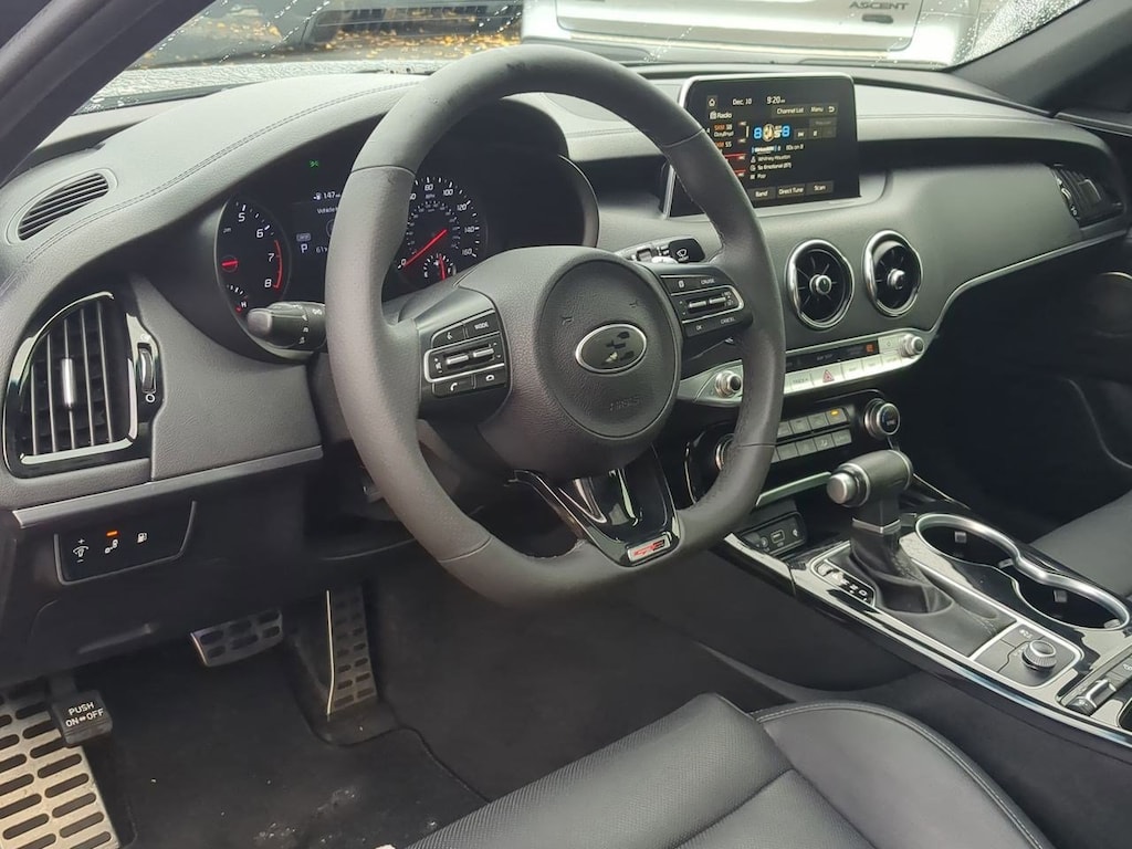 4-Wheel Disc Brakes, 6 Speakers, 8-Way Power Adjustable Passenger Seat, ABS brakes, Air Conditioning, Alloy wheels, AM/FM radio: SiriusXM, Anti-whiplash front head restraints, Apple CarPlay & Android Auto, Auto-dimming Rear-View mirror, Automatic temperature control, Brake assist, Bumpers: body-color, Carpeted Floor Mat, Delay-off headlights, Door Sill Applique, Driver door bin, Driver vanity mirror, Dual front impact airbags, Dual front side impact airbags, Electronic Stability Control, Emergency communication system: UVO eServices, Exterior Parking Camera Rear, Four wheel independent suspension, Front anti-roll bar, Front Bucket Seats, Front Center Armrest, Front dual zone A/C, Front reading lights, Fully automatic headlights, Heated door mirrors, Heated Front Bucket Seats, Heated front seats, Illuminated entry, Knee airbag, Leather Seat Trim, Low tire pressure warning, Occupant sensing airbag, Outside temperature display, Overhead airbag, Overhead console, Panic alarm, Passenger door bin, Passenger vanity mirror, Power door mirrors, Power driver seat, Power steering, Power Sunroof, Power windows, Radio: AM/FM/MP3/HD/SiriusXM Audio System, Radio: AM/FM/MP3/HD/SiriusXM harman/kardon Audio, Rear air conditioning, Rear anti-roll bar, Rear reading lights, Rear seat center armrest, Rear window defroster, Remote keyless entry, Security system, Speed control, Speed-Sensitive Wipers, Split folding rear seat, Sport steering wheel, Steering wheel mounted audio controls, Sun & Sound Package, Tachometer, Traction control, Trip computer, Turn signal indicator mirrors, Variably intermittent wipers, Wheels: 18 x 8.0 Alloy. Panthera Metal 2020 Kia Stinger GT-Line AWD 8-Speed Automatic I4