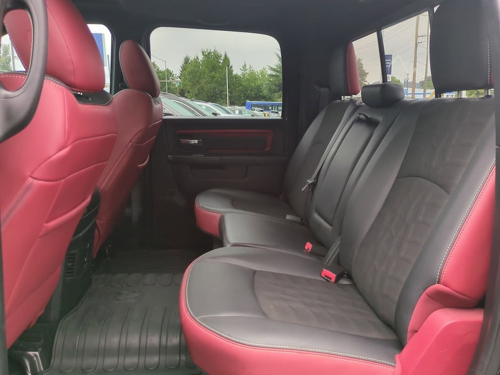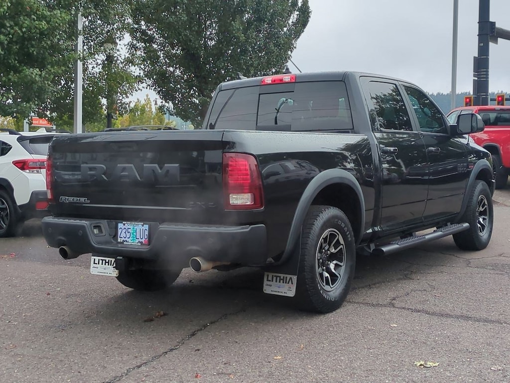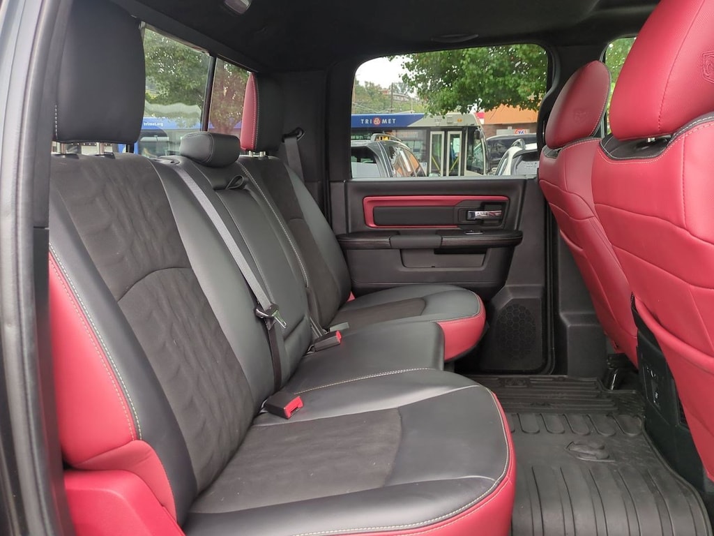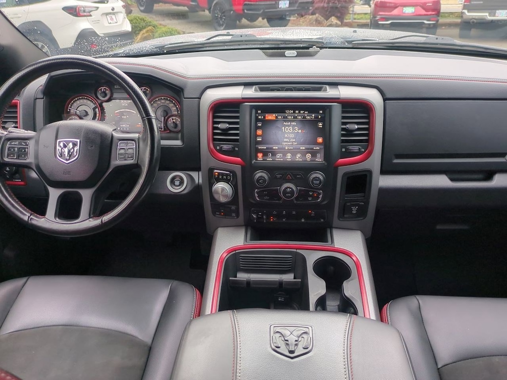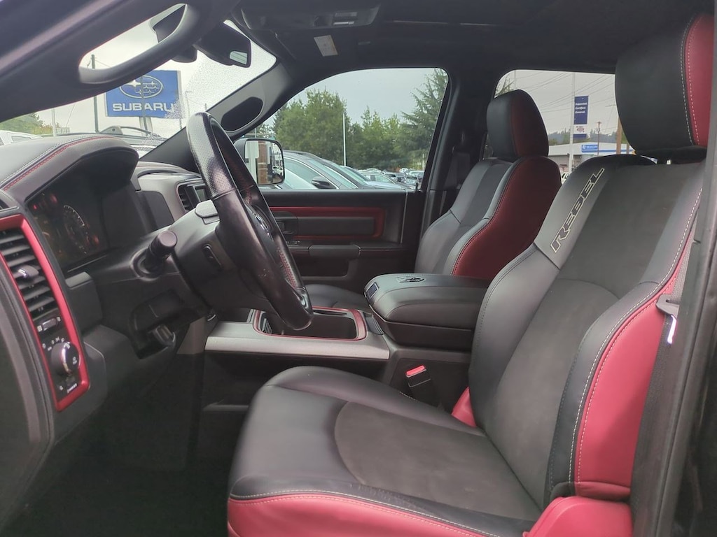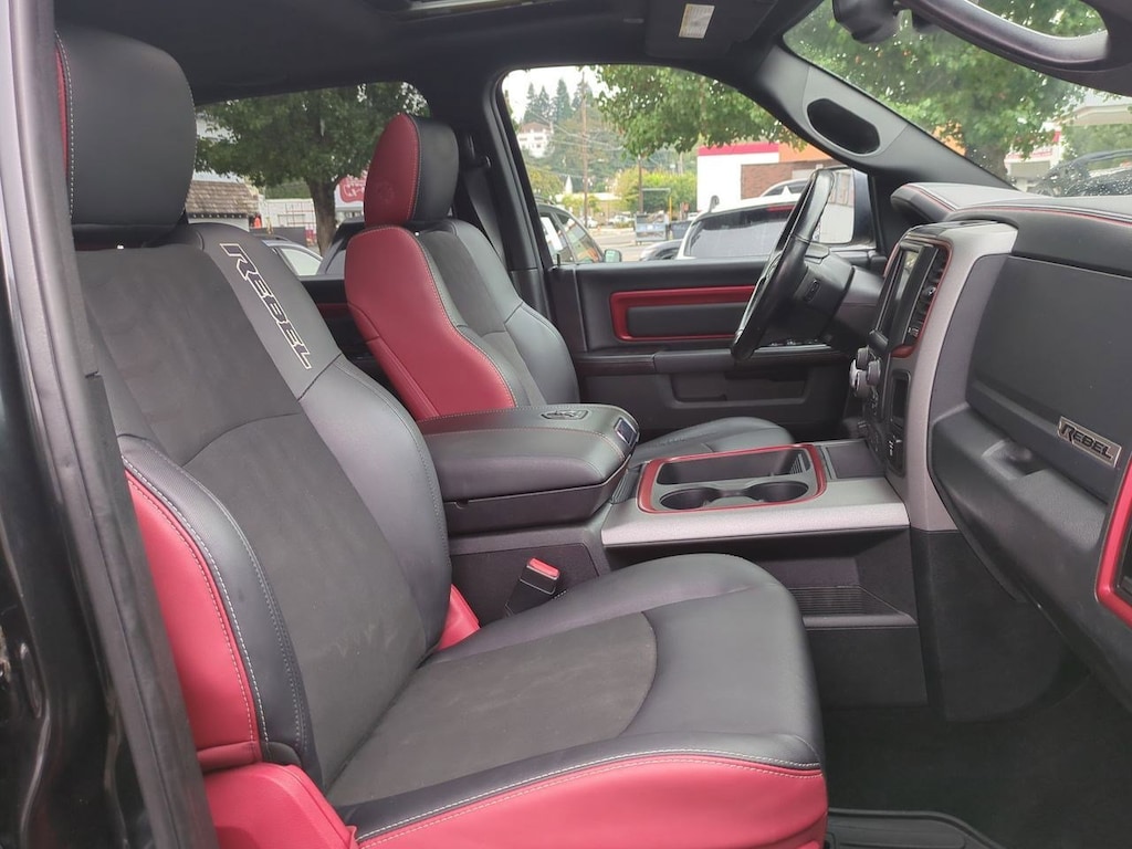 1 Yr. Trial (Registration Required), 3.92 Rear Axle Ratio, 32 Gallon Fuel Tank, 4-Wheel Disc Brakes, 5-Year SiriusXM Traffic Service, 5-Year SiriusXM Travel Link Service, 6 Speakers, 8.4 Touchscreen Display, 9 Alpine Speakers w/Subwoofer, ABS brakes, Air Conditioning, Alloy wheels, AM/FM radio, Audio Jack Input for Mobile Devices, Auto-Dimming Exterior Mirrors, Auto-Dimming Rear-View Mirror, Auto-leveling suspension, Automatic temperature control, Black Tubular Side Steps, Brake assist, Bright Rotary Shifter, Compass, Delay-off headlights, Driver door bin, Dual front impact airbags, Dual front side impact airbags, Dual Rear Exhaust w/Bright Tips, Electronic Shift, Electronic Stability Control, Emergency communication system: Uconnect Access, Engine Block Heater, Exterior Mirrors Courtesy Lamps, Exterior Mirrors w/Supplemental Signals, Flat Black 5.7L Hemi Badge, Flat Black Ram 1500 Badge, Front anti-roll bar, Front Bucket Seats, Front Center Armrest w/Storage, Front dual zone A/C, Front fog lights, Front reading lights, Front wheel independent suspension, Fully automatic headlights, Glove Box Lamp, GPS Antenna Input, GPS Navigation, HD Radio, Heated door mirrors, Heated front seats, Heated steering wheel, Illuminated entry, Integrated Voice Command w/Bluetooth, Keyless Enter-N-Go, Leather steering wheel, LED Bed Lighting, Low tire pressure warning, Luxury Group, Manufacturers Statement of Origin, Media Hub (USB, AUX), Occupant sensing airbag, Outside temperature display, Overhead airbag, Overhead console, Overhead Console w/Garage Door Opener, Panic alarm, ParkView Rear Back-Up Camera, Passenger door bin, Passenger vanity mirror, Power Black Trailer Tow Mirrors, Power door mirrors, Power driver seat, Power Heated Fold-Away Mirrors, Power passenger seat, Power steering, Power Sunroof, Power windows, Power-Folding Mirrors, Premium Cloth Seats w/Emboss Tread Pattern, Protection Group, Quick Order Package 26W Rebel, Radio data system, Radio: Uconnect 3C Nav w/8.4 Display, Radio: Uconnect 3C w/8.4 Display, Ram Glove Box Badge, Rear anti-roll bar, Rear Dome w/On/Off Switch Lamp, Rear seat center armrest, Rear step bumper, Remote keyless entry, Remote Proximity Keyless Entry, Remote USB Port, Security system, SIRIUSXM Satellite Radio, SIRIUSXM Traffic, SiriusXM Travel Link, Speed control, Split folding rear seat, Spray In Bedliner, Steering wheel mounted audio controls, Sun Visors w/Illuminated Vanity Mirrors, Tachometer, Tilt steering wheel, Tip Start, Traction control, Trailer Brake Control, Trailer Tow Mirrors, Trailer Tow Mirrors & Brake Group, Trip computer, Uconnect Access, Uconnect Access 1 Year Trial, Underhood Lamp, Universal Garage Door Opener, Variably intermittent wipers, Voltmeter, Wheels: 17 x 8 Aluminum w/Matte Black Pocket. Brilliant Black Crystal Pearlcoat 2017 Ram 1500 Rebel 4WD 8-Speed Automatic HEMI 5.7L V8 Multi Displacement VVT