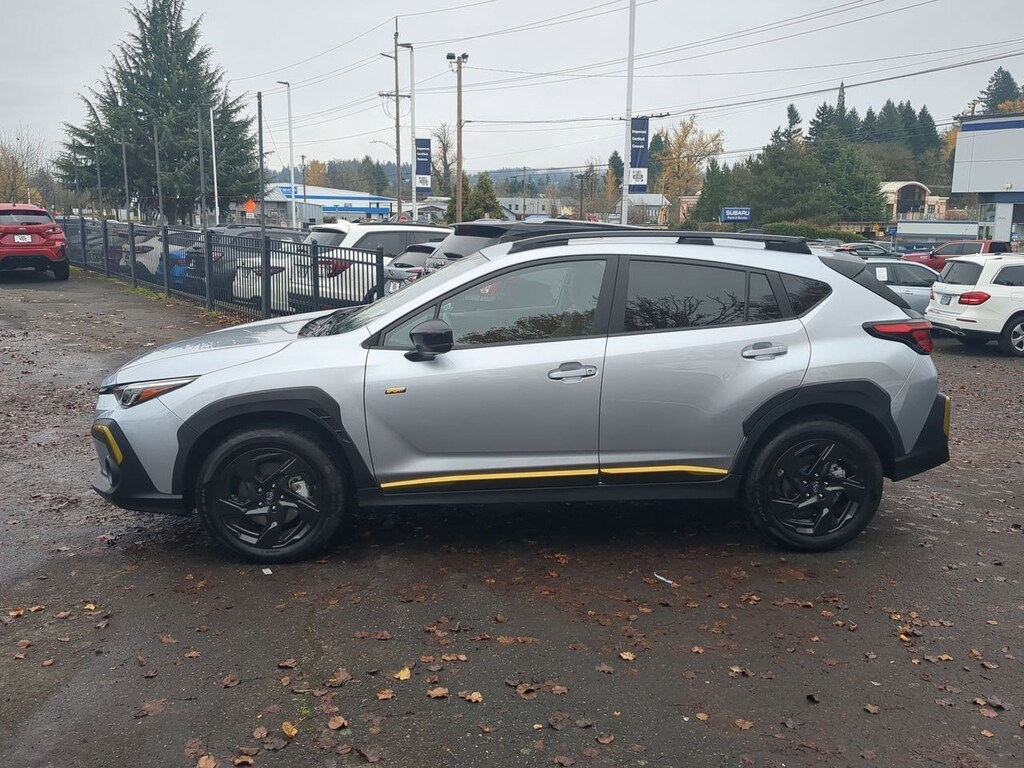 10-Way Power Drivers Seat, 3.70 Axle Ratio, 4-Wheel Disc Brakes, 6 Speakers, ABS brakes, Air Conditioning, Alloy wheels, AM/FM radio: SiriusXM, Anti-whiplash front head restraints, Auto High-beam Headlights, Automatic temperature control, Blind Spot Detection w/Rear Cross-Traffic Alert, Brake assist, BSD/RCTA & Power Driver Seat & Power Moonroof, Bumpers: body-color, Driver door bin, Driver vanity mirror, Dual front impact airbags, Dual front side impact airbags, Electronic Stability Control, Emergency communication system: STARLINK Safety and Security (Subscription Required), Exterior Parking Camera Rear, Four wheel independent suspension, Front anti-roll bar, Front Bucket Seats, Front Center Armrest, Front dual zone A/C, Front fog lights, Front reading lights, Fully automatic headlights, Heated door mirrors, Heated Front Bucket Seats, Heated front seats, Illuminated entry, Knee airbag, Leather Shift Knob, Low tire pressure warning, Occupant sensing airbag, Outside temperature display, Overhead airbag, Overhead console, Panic alarm, Passenger door bin, Passenger vanity mirror, Power door mirrors, Power Moonroof, Power steering, Power windows, Radio data system, Radio: Subaru STARLINK 11.6 Multimedia Plus Sys, Rear anti-roll bar, Rear seat center armrest, Rear window defroster, Rear window wiper, Remote keyless entry, Security system, Speed control, Speed-sensing steering, Split folding rear seat, Spoiler, Sport Cloth Upholstery, STARLINK/Apple CarPlay/Android Auto, Steering wheel mounted audio controls, Tachometer, Telescoping steering wheel, Tilt steering wheel, Traction control, Trip computer, Turn signal indicator mirrors, Variably intermittent wipers, Wheels: 18 x 7.0J Dark Gray Aluminum Alloy. Ice Silver Metallic 2024 Subaru Crosstrek Sport AWD Lineartronic CVT 2.5L 4-Cylinder DOHC 16V