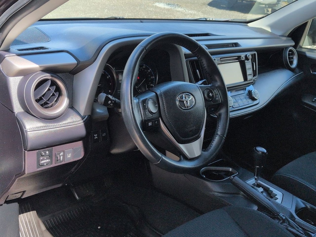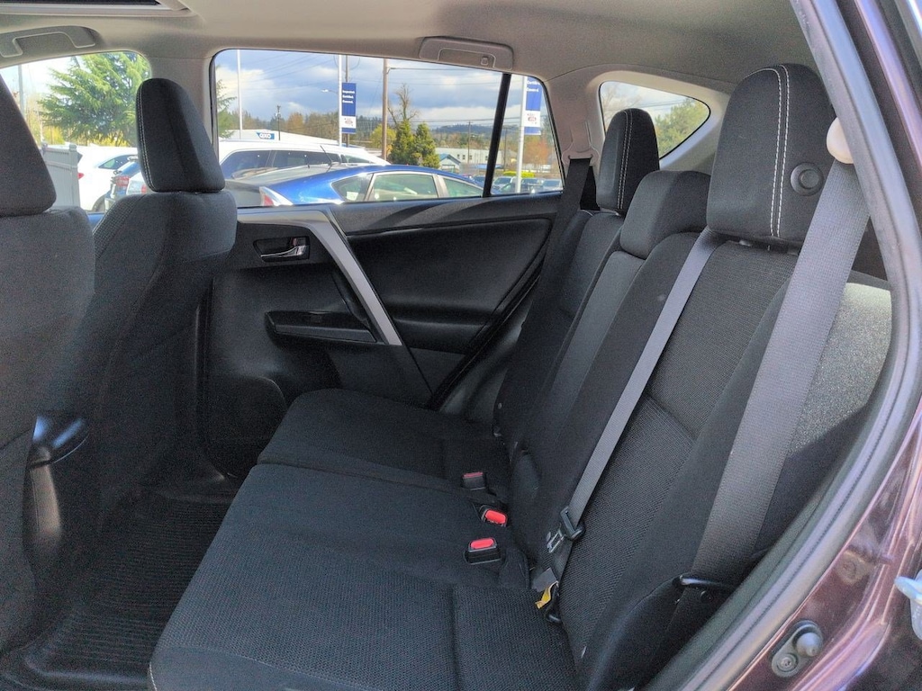 AWD, Cloth, 4-Wheel Disc Brakes, 4.071 Axle Ratio, 6 Speakers, ABS brakes, Air Conditioning, Alloy wheels, AM/FM radio, Auto High-beam Headlights, Automatic temperature control, Brake assist, Bumpers: body-color, CD player, Driver door bin, Driver vanity mirror, Dual front impact airbags, Dual front side impact airbags, Electronic Stability Control, Exterior Parking Camera Rear, Fabric Seat Trim, Four wheel independent suspension, Front anti-roll bar, Front Bucket Seats, Front Center Armrest, Front dual zone A/C, Front fog lights, Front reading lights, Front Sport Seats, Fully automatic headlights, Heated door mirrors, Illuminated entry, Knee airbag, Leather steering wheel, Low tire pressure warning, Occupant sensing airbag, Outside temperature display, Overhead airbag, Overhead console, Panic alarm, Passenger door bin, Passenger vanity mirror, Power door mirrors, Power moonroof, Power steering, Power windows, Radio data system, Radio: Entune AM/FM/CD/MP3/WMA Playback w/6 Speakers, Radio: Entune Audio Plus AM/FM/MP3/WMA Playback, Rear anti-roll bar, Rear seat center armrest, Rear window defroster, Rear window wiper, Remote keyless entry, Speed control, Speed-sensing steering, Split folding rear seat, Spoiler, Steering wheel mounted audio controls, Tachometer, Telescoping steering wheel, Tilt steering wheel, Traction control, Trip computer, Turn signal indicator mirrors, Variably intermittent wipers, Wheels: 17 x 7.0J 5-Spoke Superchrome Alloy, AWD, Cloth. Purple 2017 Toyota RAV4 XLE AWD 6-Speed Automatic 2.5L 4-Cylinder DOHC Dual VVT-i