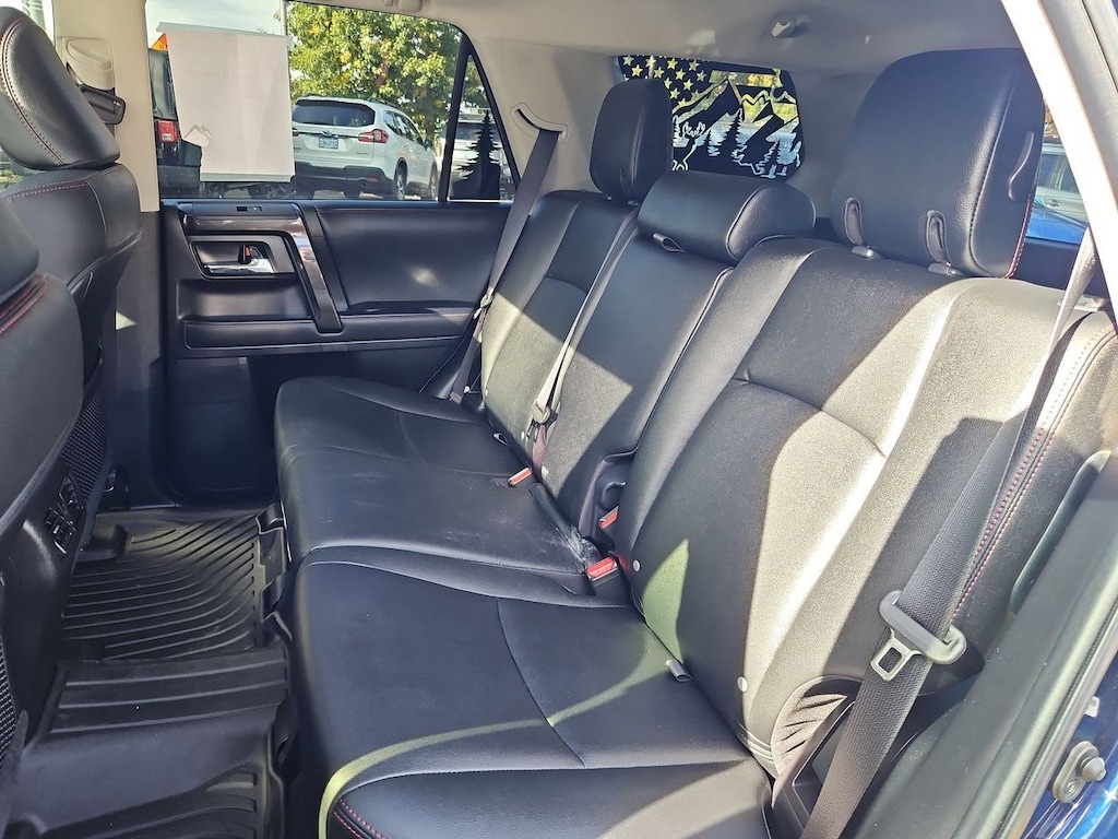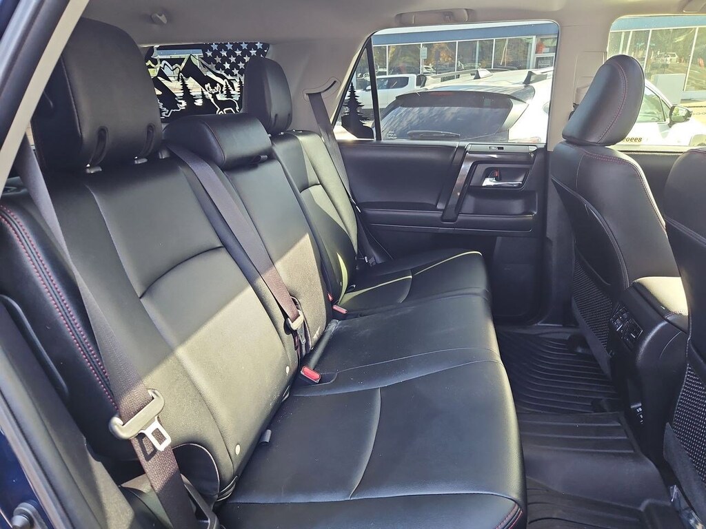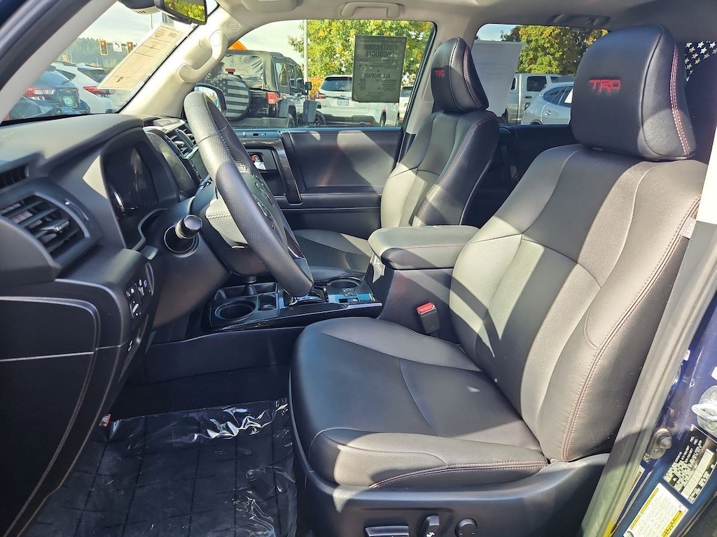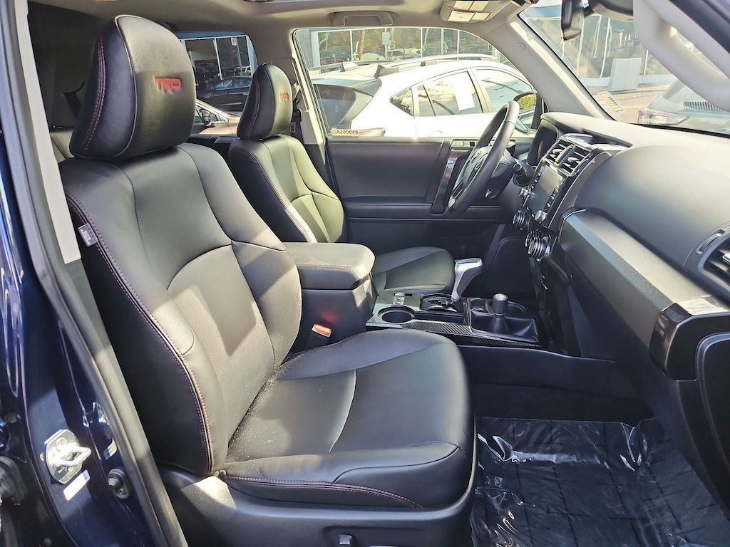 4WD, 3.727 Axle Ratio, 4-Wheel Disc Brakes, 8 Speakers, ABS brakes, Air Conditioning, Alloy wheels, AM/FM radio: SiriusXM, Anti-whiplash front head restraints, Apple CarPlay/Android Auto, Auto High-beam Headlights, Auto-dimming Rear-View mirror, Black Roof Rails, Body Color Heated Mirrors, Brake assist, Bumpers: body-color, Compass, Driver door bin, Driver vanity mirror, Dual front impact airbags, Dual front side impact airbags, Electronic Stability Control, Emergency communication system: Safety Connect with 1-year trial, Exterior Parking Camera Rear, Front anti-roll bar, Front Bucket Seats, Front Center Armrest, Front fog lights, Front reading lights, Front wheel independent suspension, Garage Door Opener, Garage door transmitter: HomeLink, Heated door mirrors, Heated Front Bucket Seats, Heated front seats, Illuminated entry, Knee airbag, Leather Shift Knob, Low tire pressure warning, Occupant sensing airbag, Outside temperature display, Overhead airbag, Overhead console, Panic alarm, Passenger door bin, Passenger vanity mirror, Power door mirrors, Power driver seat, Power passenger seat, Power steering, Power windows, Radio: Premium Audio w/Dynamic Navigation, Rear anti-roll bar, Rear seat center armrest, Rear window defroster, Rear window wiper, Remote keyless entry, Roof rack: rails only, Security system, Softex Synthetic Leather Seat Trim, Speed control, Speed-sensing steering, Split folding rear seat, Spoiler, Steering wheel mounted audio controls, Tachometer, Telescoping steering wheel, Tilt steering wheel, Traction control, Trip computer, Turn signal indicator mirrors, Variably intermittent wipers, Wheels: 17 x 7.5 7-Spoke Unique Off-Road Alloy, 4WD. Blue 2021 Toyota 4Runner TRD Off-Road Premium 4WD 5-Speed Automatic with Overdrive 4.0L V6 SMPI DOHC