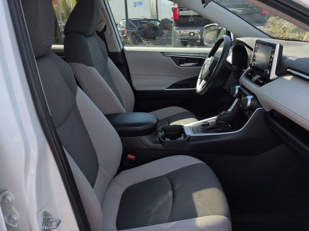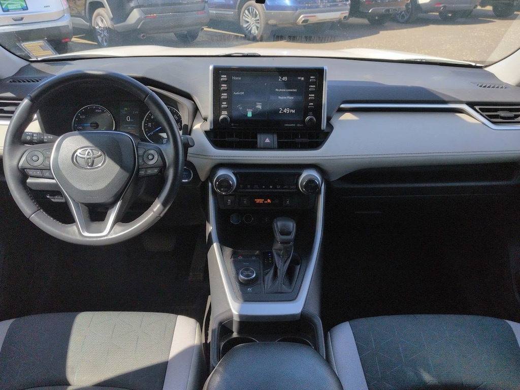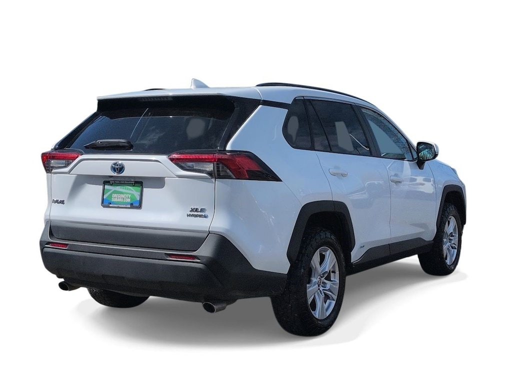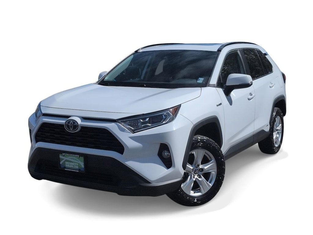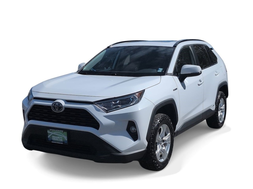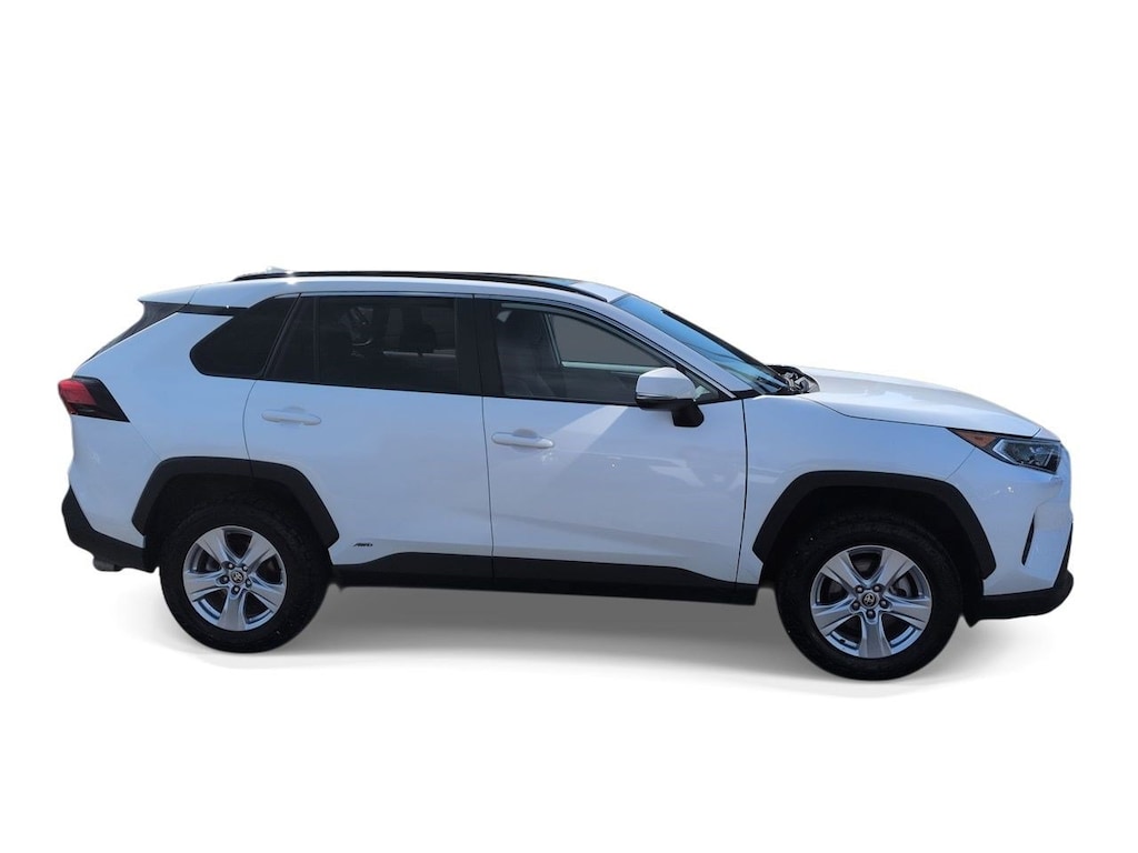 2.5L 4-Cylinder, 4-Wheel Disc Brakes, 6 Speakers, ABS brakes, Air Conditioning, Alloy wheels, AM/FM radio: SiriusXM, AM/FM Stereo, Apple CarPlay/Android Auto, Auto High-beam Headlights, Automatic temperature control, Axle Ratio: TBD, Brake assist, Bumpers: body-color, Delay-off headlights, Driver door bin, Driver vanity mirror, Dual front impact airbags, Dual front side impact airbags, Electronic Stability Control, Emergency communication system: Safety Connect with 1-year trial, Exterior Parking Camera Rear, Fabric Seat Trim (FA), Four wheel independent suspension, Front anti-roll bar, Front Bucket Seats, Front Center Armrest, Front dual zone A/C, Front fog lights, Front reading lights, Front Sport Seats, Fully automatic headlights, Heated door mirrors, Illuminated entry, Knee airbag, Lane Departure Warning System, Low tire pressure warning, Occupant sensing airbag, Outside temperature display, Overhead airbag, Overhead console, Panic alarm, Passenger door bin, Passenger vanity mirror, Power door mirrors, Power driver seat, Power steering, Power windows, Radio data system, Rear anti-roll bar, Rear seat center armrest, Rear window defroster, Rear window wiper, Remote keyless entry, Roof rack: rails only, Speed control, Speed-sensing steering, Split folding rear seat, Spoiler, Steering wheel mounted audio controls, Telescoping steering wheel, Tilt steering wheel, Traction control, Trip computer, Turn signal indicator mirrors, Updated Battery, Variably intermittent wipers, Wheels: 17 x 7.0J Silver Aluminum Alloy, 2.5L 4-Cylinder. Super White 2021 Toyota RAV4 Hybrid XLE AWD eCVT 2.5L 4-Cylinder
