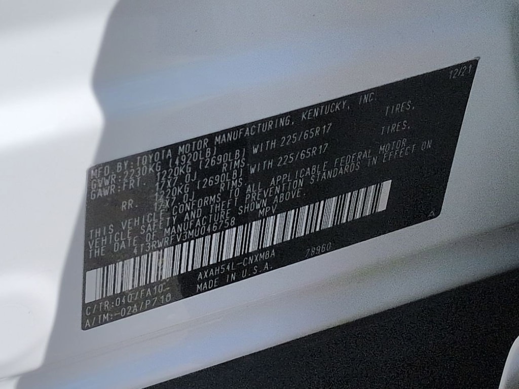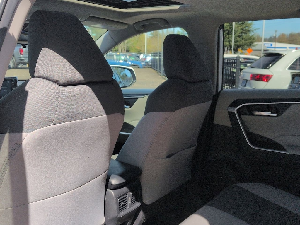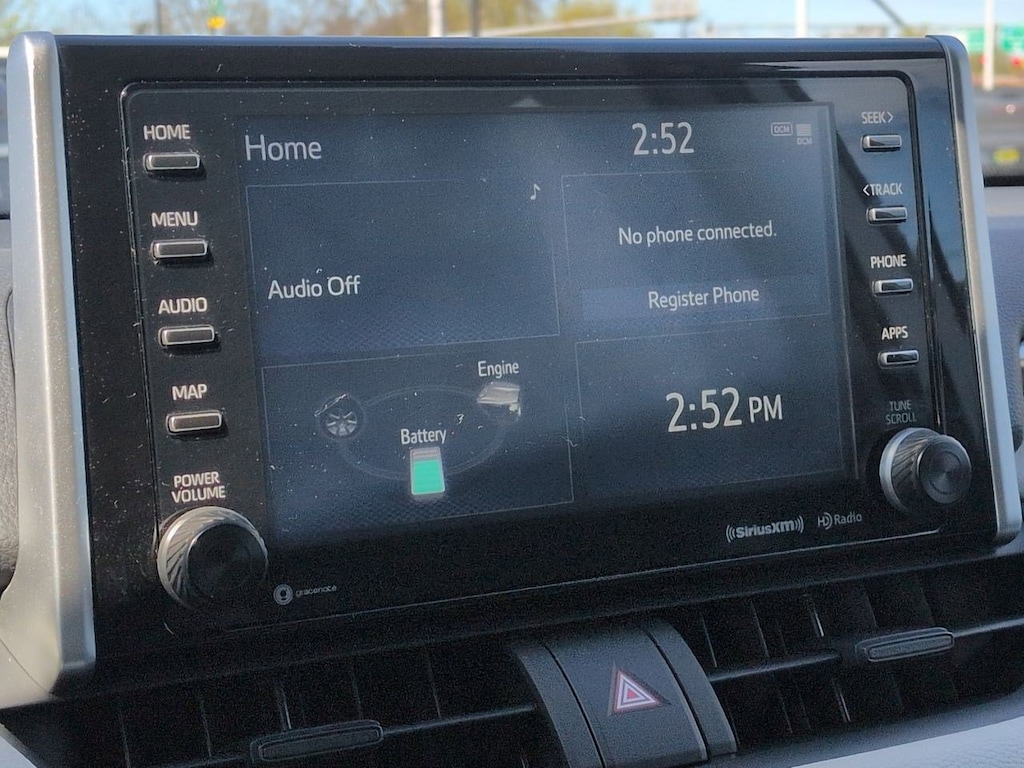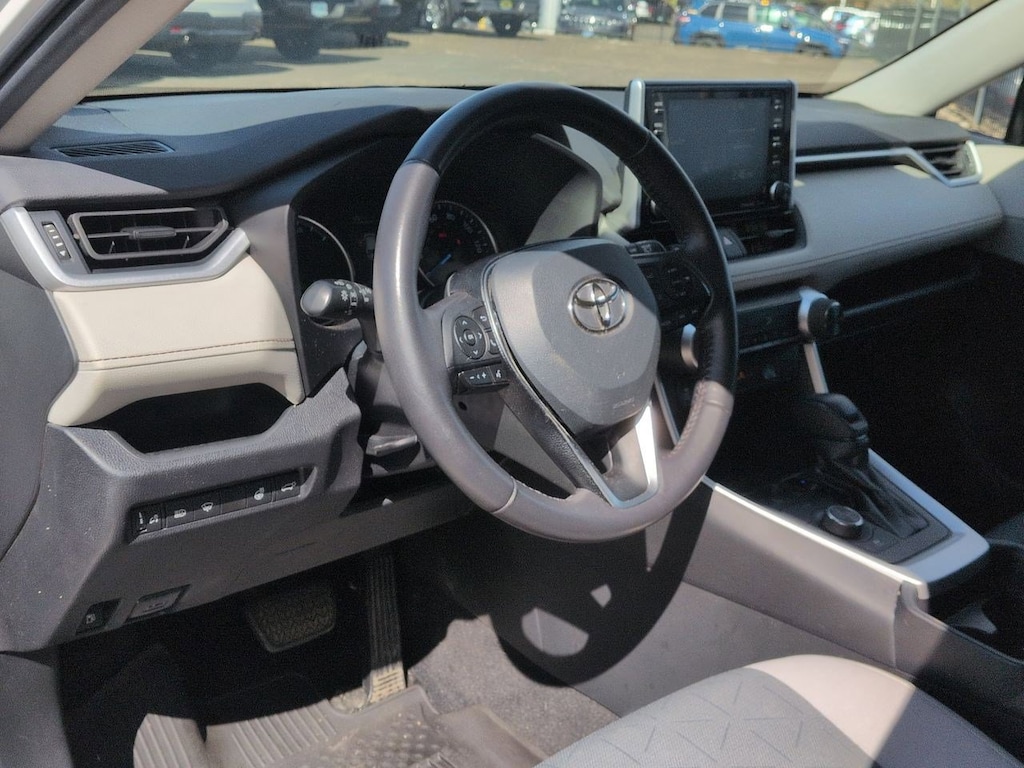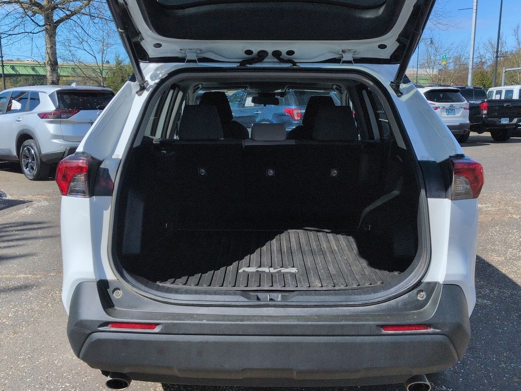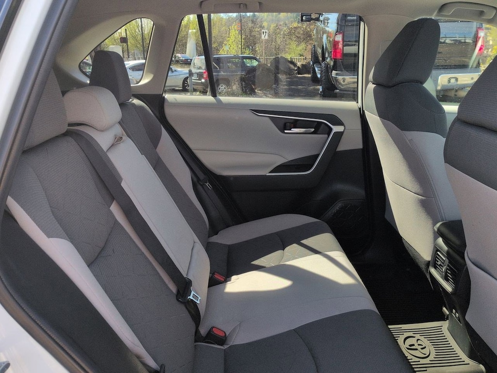 2.5L 4-Cylinder, 4-Wheel Disc Brakes, 6 Speakers, ABS brakes, Air Conditioning, Alloy wheels, AM/FM radio: SiriusXM, AM/FM Stereo, Apple CarPlay/Android Auto, Auto High-beam Headlights, Automatic temperature control, Axle Ratio: TBD, Brake assist, Bumpers: body-color, Delay-off headlights, Driver door bin, Driver vanity mirror, Dual front impact airbags, Dual front side impact airbags, Electronic Stability Control, Emergency communication system: Safety Connect with 1-year trial, Exterior Parking Camera Rear, Fabric Seat Trim (FA), Four wheel independent suspension, Front anti-roll bar, Front Bucket Seats, Front Center Armrest, Front dual zone A/C, Front fog lights, Front reading lights, Front Sport Seats, Fully automatic headlights, Heated door mirrors, Illuminated entry, Knee airbag, Lane Departure Warning System, Low tire pressure warning, Occupant sensing airbag, Outside temperature display, Overhead airbag, Overhead console, Panic alarm, Passenger door bin, Passenger vanity mirror, Power door mirrors, Power driver seat, Power steering, Power windows, Radio data system, Rear anti-roll bar, Rear seat center armrest, Rear window defroster, Rear window wiper, Remote keyless entry, Roof rack: rails only, Speed control, Speed-sensing steering, Split folding rear seat, Spoiler, Steering wheel mounted audio controls, Telescoping steering wheel, Tilt steering wheel, Traction control, Trip computer, Turn signal indicator mirrors, Updated Battery, Variably intermittent wipers, Wheels: 17 x 7.0J Silver Aluminum Alloy, 2.5L 4-Cylinder. Super White 2021 Toyota RAV4 Hybrid XLE AWD eCVT 2.5L 4-Cylinder