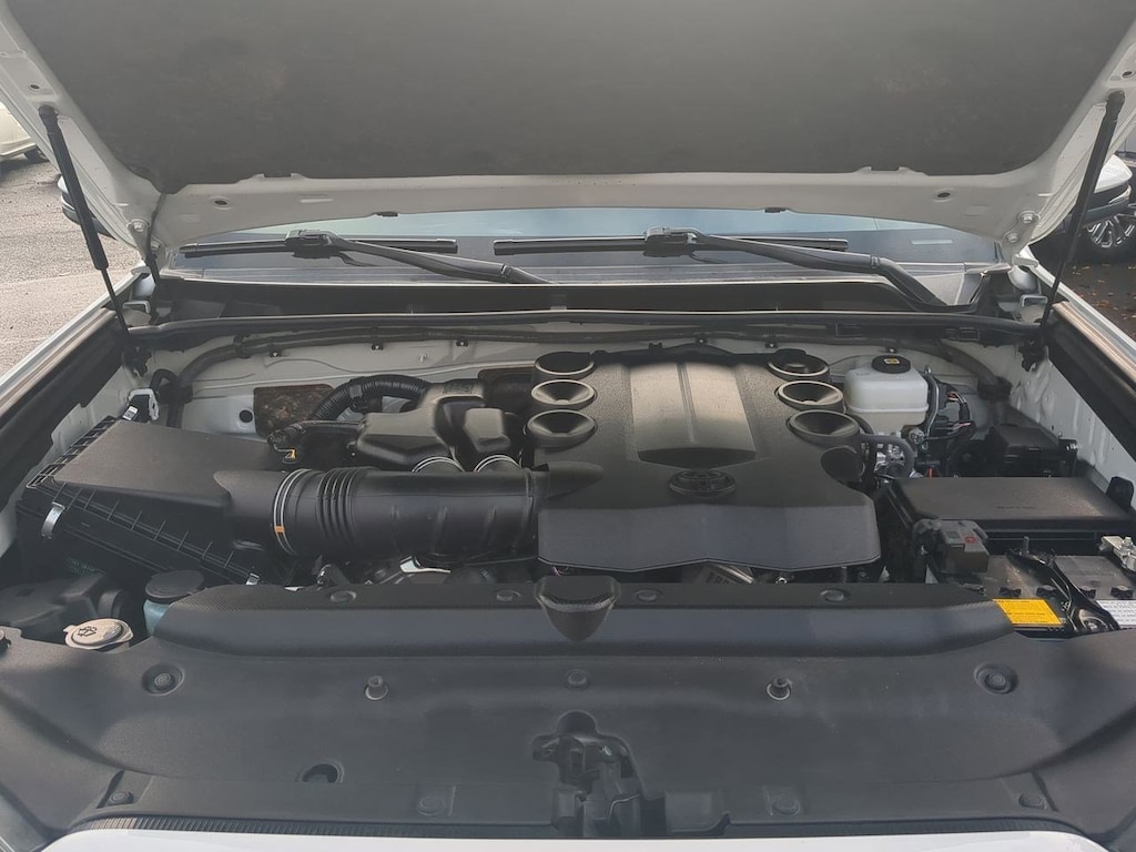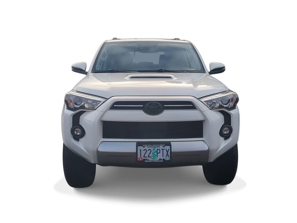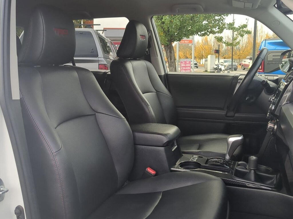 4WD, 3.727 Axle Ratio, 4-Wheel Disc Brakes, 8 Speakers, ABS brakes, Air Conditioning, Alloy wheels, AM/FM radio: SiriusXM, Anti-whiplash front head restraints, Apple CarPlay/Android Auto, Auto High-beam Headlights, Auto-dimming Rear-View mirror, Black Roof Rails, Brake assist, Bumpers: body-color, Compass, Driver door bin, Driver vanity mirror, Dual front impact airbags, Dual front side impact airbags, Electronic Stability Control, Emergency communication system: Safety Connect (1-year trial), Exterior Parking Camera Rear, Front anti-roll bar, Front Bucket Seats, Front Center Armrest, Front fog lights, Front reading lights, Front wheel independent suspension, Garage Door Opener, Garage door transmitter: HomeLink, Heated door mirrors, Heated Front Bucket Seats, Heated front seats, Heated Outside Rear-View Mirrors, Illuminated entry, Knee airbag, Leather Shift Knob, Low tire pressure warning, Navigation System, Occupant sensing airbag, Outside temperature display, Overhead airbag, Overhead console, Panic alarm, Passenger door bin, Passenger vanity mirror, Power door mirrors, Power driver seat, Power passenger seat, Power steering, Power windows, Radio: Premium Audio w/Dynamic Navigation, Rear anti-roll bar, Rear seat center armrest, Rear window defroster, Rear window wiper, Remote keyless entry, Roof rack: rails only, Security system, SofTex Seat Trim, Speed control, Speed-sensing steering, Split folding rear seat, Spoiler, Steering wheel mounted audio controls, Tachometer, Telescoping steering wheel, Tilt steering wheel, Traction control, Trip computer, Turn signal indicator mirrors, Variably intermittent wipers, Wheels: 17 Unique 7-Spoke Off-Road Alloy, 4WD. White 2023 Toyota 4Runner TRD Off-Road Premium 4WD 5-Speed with ECT 4.0L V6 DOHC 24V