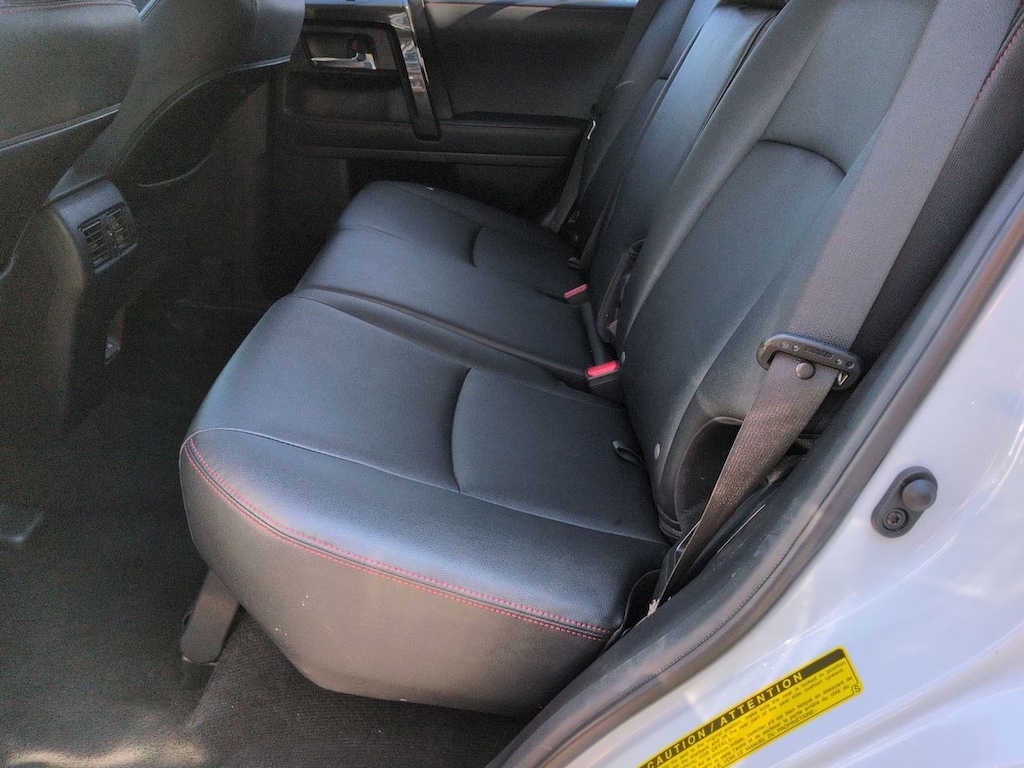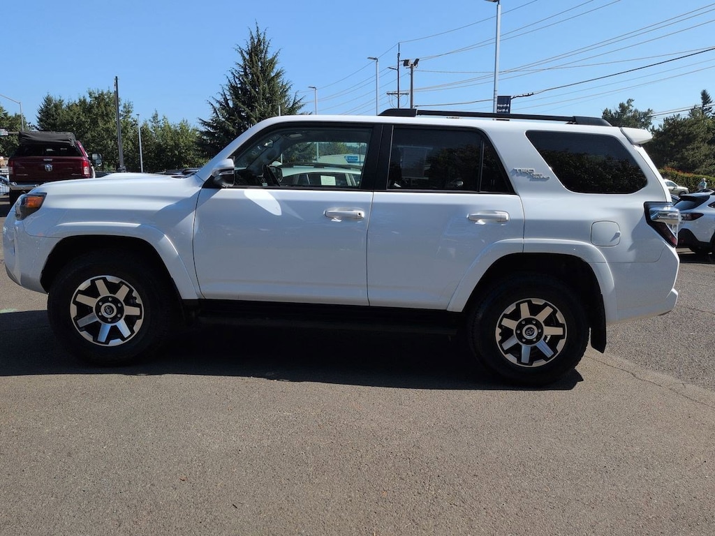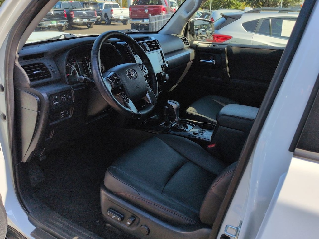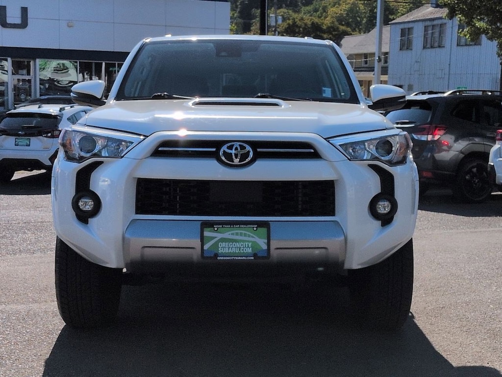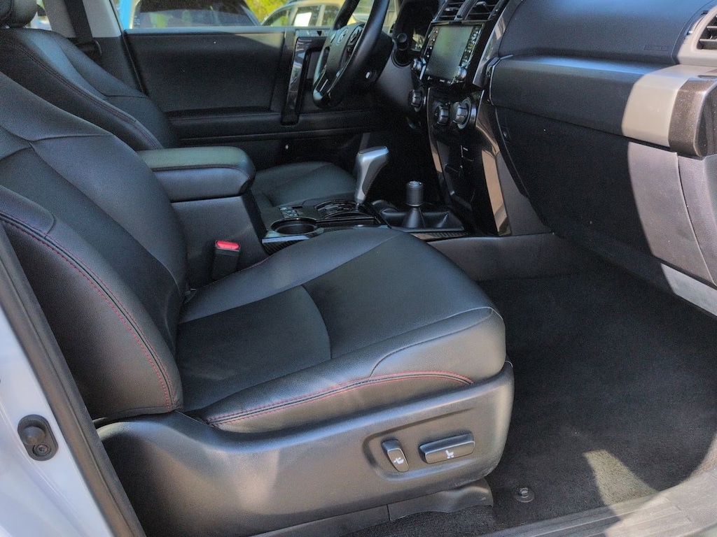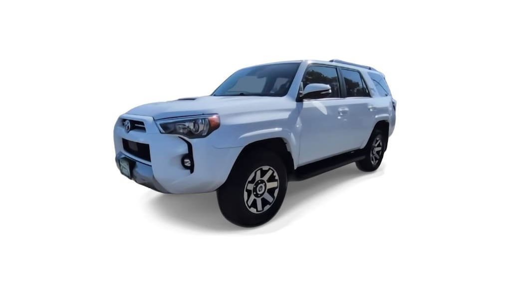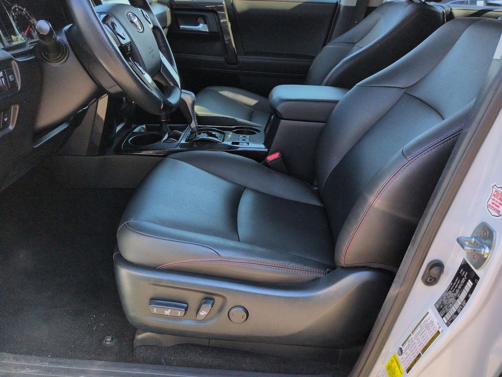 4WD, 3.727 Axle Ratio, 4-Wheel Disc Brakes, 8 Speakers, ABS brakes, Air Conditioning, Alloy wheels, AM/FM radio: SiriusXM, Anti-whiplash front head restraints, Apple CarPlay/Android Auto, Auto High-beam Headlights, Auto-dimming Rear-View mirror, Black Roof Rails, Brake assist, Bumpers: body-color, Compass, Driver door bin, Driver vanity mirror, Dual front impact airbags, Dual front side impact airbags, Electronic Stability Control, Emergency communication system: Safety Connect (1-year trial), Exterior Parking Camera Rear, Front anti-roll bar, Front Bucket Seats, Front Center Armrest, Front fog lights, Front reading lights, Front wheel independent suspension, Garage Door Opener, Garage door transmitter: HomeLink, Heated door mirrors, Heated Front Bucket Seats, Heated front seats, Heated Outside Rear-View Mirrors, Heated steering wheel, Illuminated entry, Knee airbag, Leather Shift Knob, Low tire pressure warning, Navigation System, Occupant sensing airbag, Outside temperature display, Overhead airbag, Overhead console, Panic alarm, Passenger door bin, Passenger vanity mirror, Power door mirrors, Power driver seat, Power passenger seat, Power steering, Power windows, Radio: Premium Audio, Rear anti-roll bar, Rear seat center armrest, Rear window defroster, Rear window wiper, Remote keyless entry, Security system, SofTex Seat Trim, Speed control, Speed-sensing steering, Split folding rear seat, Spoiler, Steering wheel mounted audio controls, Tachometer, Telescoping steering wheel, Tilt steering wheel, Traction control, Trip computer, Turn signal indicator mirrors, Variably intermittent wipers, Wheels: 17 Unique 7-Spoke Off-Road Alloy, 4WD. White 2024 Toyota 4Runner TRD Off-Road Premium 4WD 5-Speed with ECT 4.0L V6 DOHC 24V