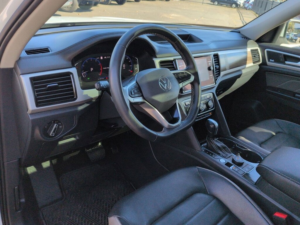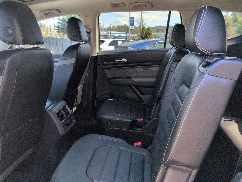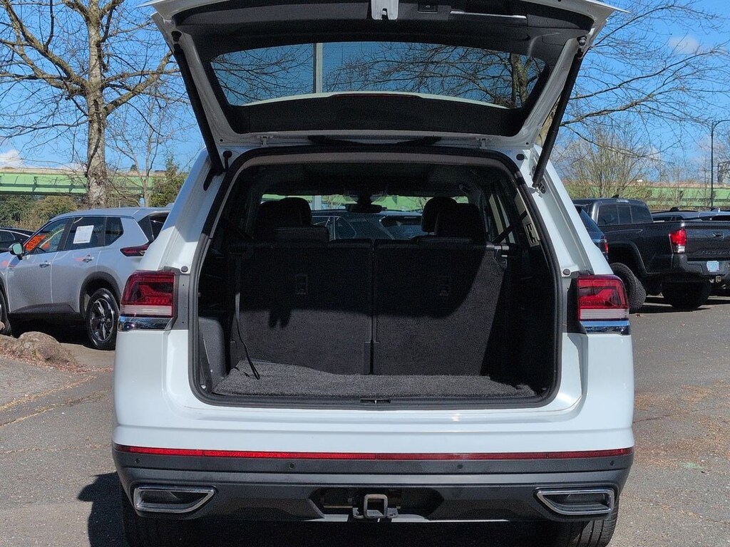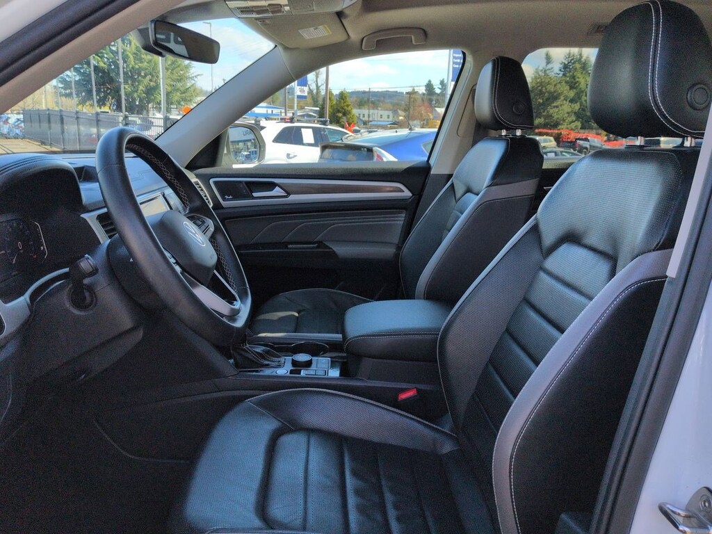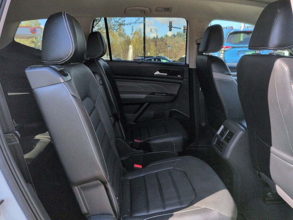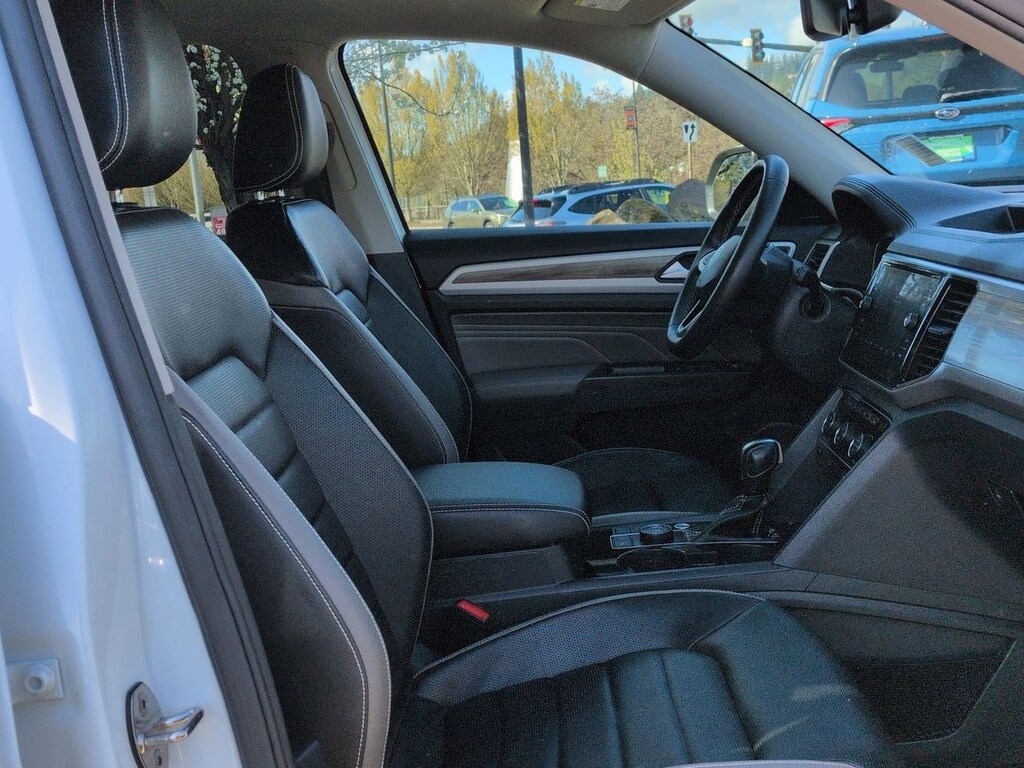 12 Speakers, 2nd-Row Dual Captains Chairs, 3.60 Axle Ratio, 3rd row seats: split-bench, 4-Wheel Disc Brakes, ABS brakes, Air Conditioning, Alloy wheels, Auto High-beam Headlights, Auto-dimming Rear-View mirror, Automatic temperature control, Brake assist, Bumpers: body-color, Compass, Delay-off headlights, Driver door bin, Driver vanity mirror, Dual front impact airbags, Dual front side impact airbags, Electronic Stability Control, Emergency communication system: VW Car-Net services (capabilities require enrollment or subscription), First Aid Kit, Four wheel independent suspension, Front anti-roll bar, Front Bucket Seats, Front Center Armrest, Front dual zone A/C, Front fog lights, Front reading lights, Fully automatic headlights, Heated door mirrors, Heated front seats, Heated rear seats, Heated steering wheel, Heavy Duty Trunk Liner w/VW CarGo Blocks, Htd/Actively Ventilated Comfort Front Sport Seats, Illuminated entry, Leather Shift Knob, Low tire pressure warning, Memory seat, Navigation System, Occupant sensing airbag, Outside temperature display, Overhead airbag, Overhead console, Panic alarm, Passenger door bin, Passenger vanity mirror, Perforated Vienna Leather Seating Surfaces, Power door mirrors, Power driver seat, Power Liftgate, Power moonroof, Power passenger seat, Power steering, Power windows, Privacy Cover, Radio data system, Rain sensing wipers, Rear air conditioning, Rear anti-roll bar, Rear audio controls, Rear reading lights, Rear seat center armrest, Rear window defroster, Rear window wiper, Remote keyless entry, Roadside Assistance Kit, Roof rack: rails only, Rubber Mats Kit - Captains Chairs, Security system, Speed control, Speed-sensing steering, Split folding rear seat, Spoiler, Standard Suspension, Steering wheel mounted audio controls, Tachometer, Telescoping steering wheel, Tilt steering wheel, Traction control, Trip computer, Turn signal indicator mirrors, Variably intermittent wipers, Ventilated front seats, Volkswagen Logo Puddle Lights, Wheels: 20 5-Spoke 2-Tone Machined Alloy. Pure White 2021 Volkswagen Atlas SEL Premium AWD 8-Speed Automatic with Tiptronic 3.6L V6